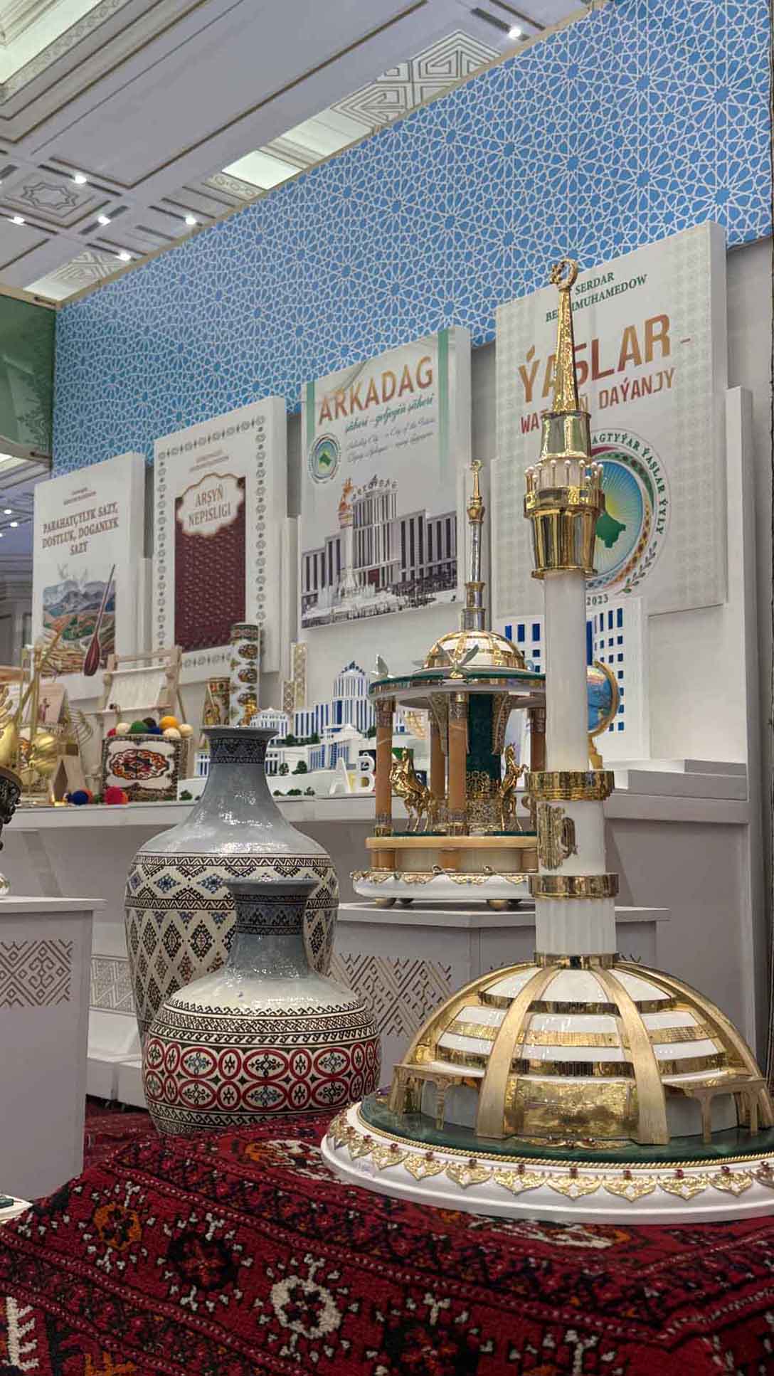 At the exhibition devoted to 34th anniversary of independence of Turkmenistan have been presented the magnificent treasures stored in the State museum of the State cultural centre of Turkmenistan. These treasures are the jewellery glorifying the policy of the country. These works of art have been presented to the National leader of the Turkmen people, Chairman of Halk Maslahaty of Turkmenistan Hero Arkadagu and the President of Turkmenistan Hero Arkadagly Serdar by foreign politicians and the ministries of our country. All these jewellery reflecting the policy of our Fatherland and majestic buildings of capital are made of precious metals and decorated by precious stones.
