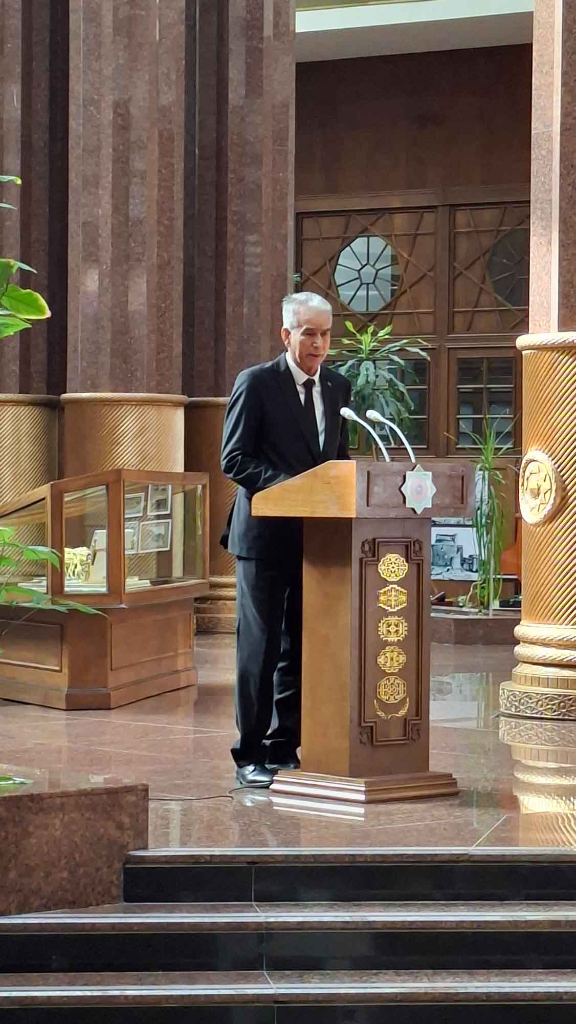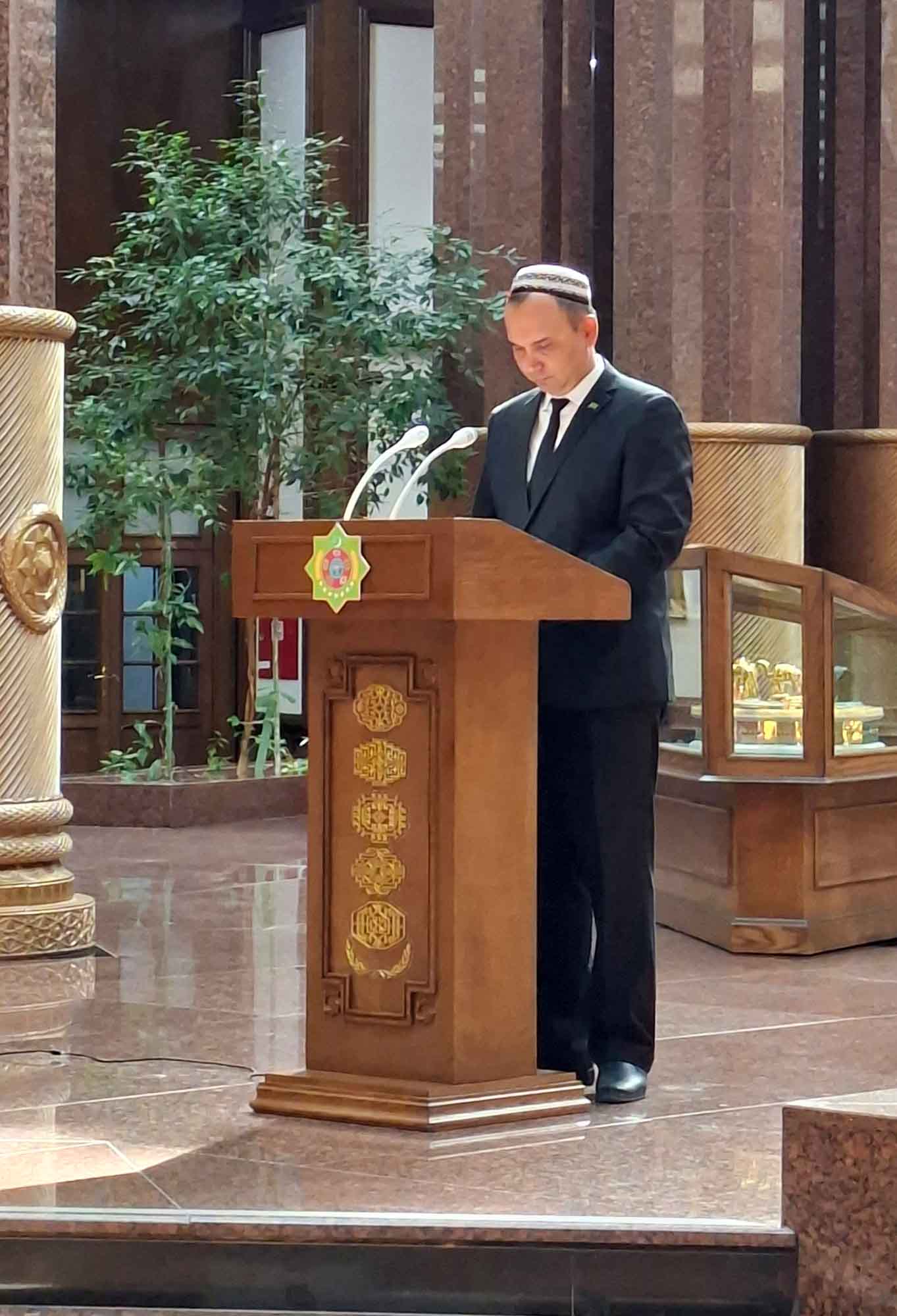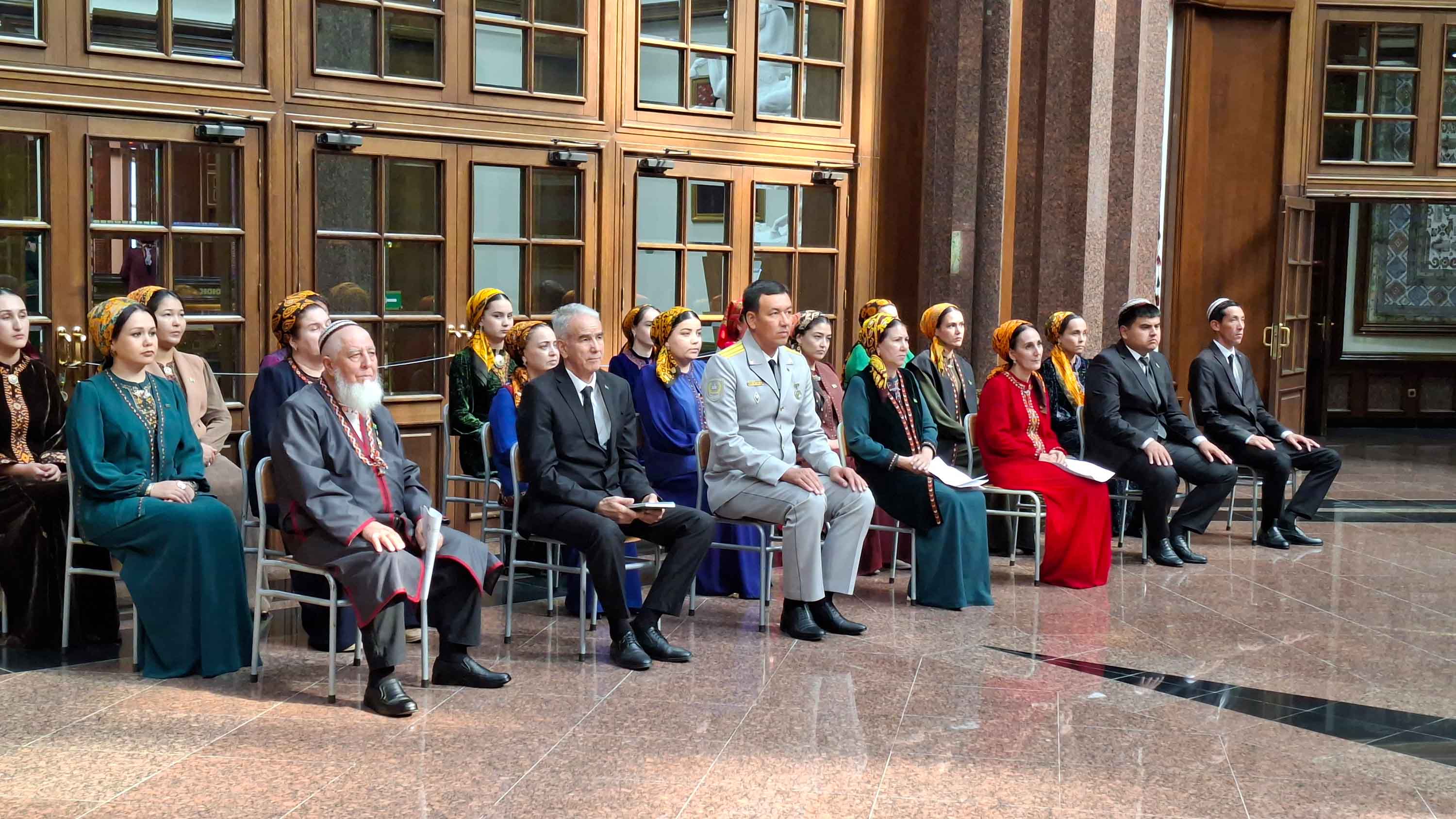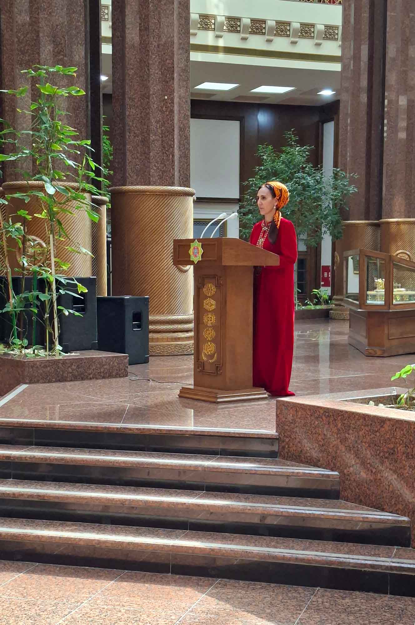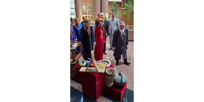 The exhibition was opened and conducted by the senior staff scientist of the division of Fine Arts of the State museum of the State cultural centre of Turkmenistan Dovlet Rejepov. Then the floor was given to the deputy director of the institute of History and archaeology of the Academy of Sciences of Turkmenistan, candidate of historical science Khan-Durdy Gurbanov, senior staff scientist of Magtymguly institute of Language, literature and national manuscripts Shasenem Amadova, head of restoration division and cultural and enlightener division of Geokdepe national museum Tavus Amanmyradova, specialist of educational division in connections with civic organization of the Military institute of the Ministry of Defense of Turkmenistan, major Kerim Myradov, inhabitant of Ashgabat city, pensioner, the Honoured elder of Turkmenistan Orazguly Karatаev.