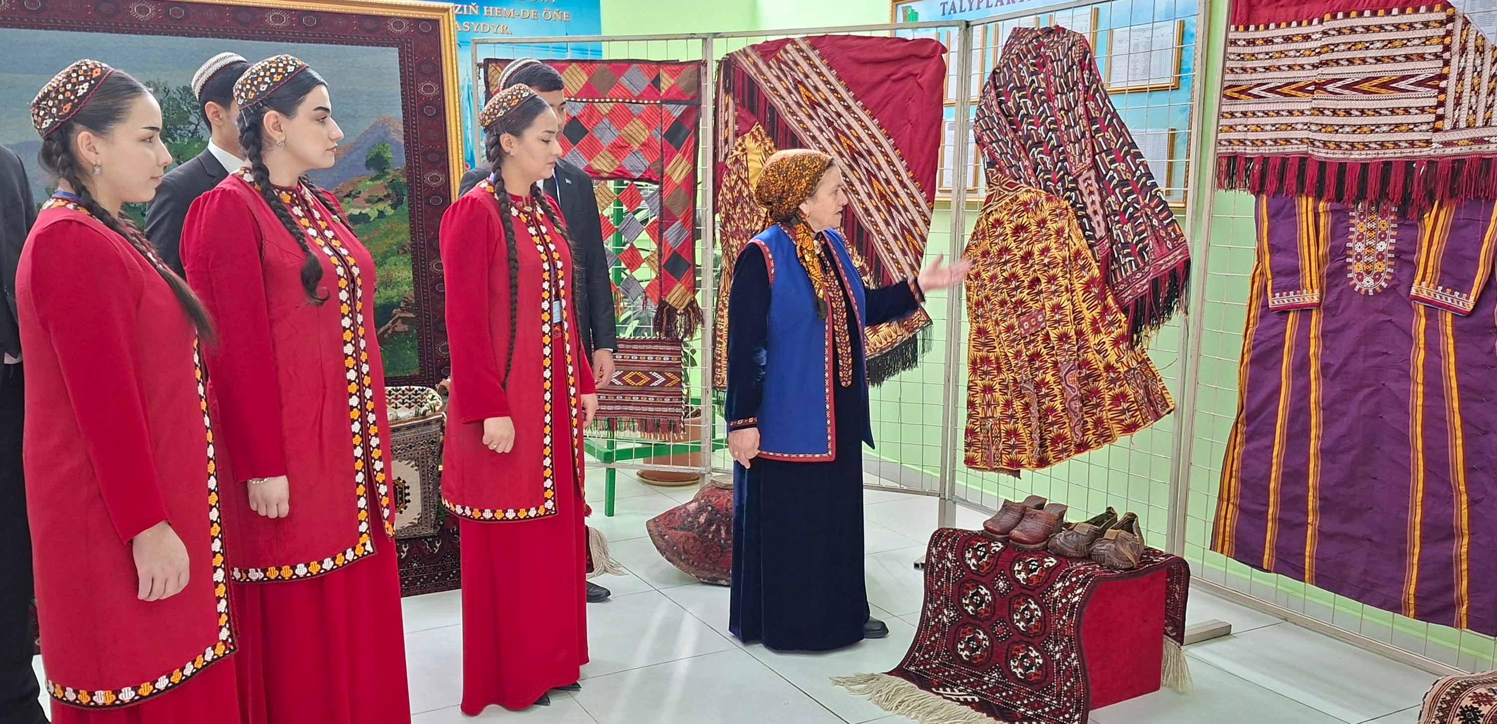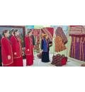At the exhibition are presented ancient carpet products, horse harness, woman’s dresses glorifying the nationality of the Turkmen people. Among them there are saddlebags with cotton and cocoon adorned with the ornaments of the five regions of Turkmenistan, bags, mat bags, spindle bags, camel adornments, and other carpet products. The centre of the exhibition is given to the carpets depicting Akhalteke horses and Turkmen nature. Decorative horse accessories, including breast collars, eye flaps, and neck adornments are also among them. Since ancient times, the Turkmen people have woven various carpet products for their horses. Among the exhibits are a saddle, sweat cloth, shabrack and a whip. There are also presented figurines of Akhalteke horses.
