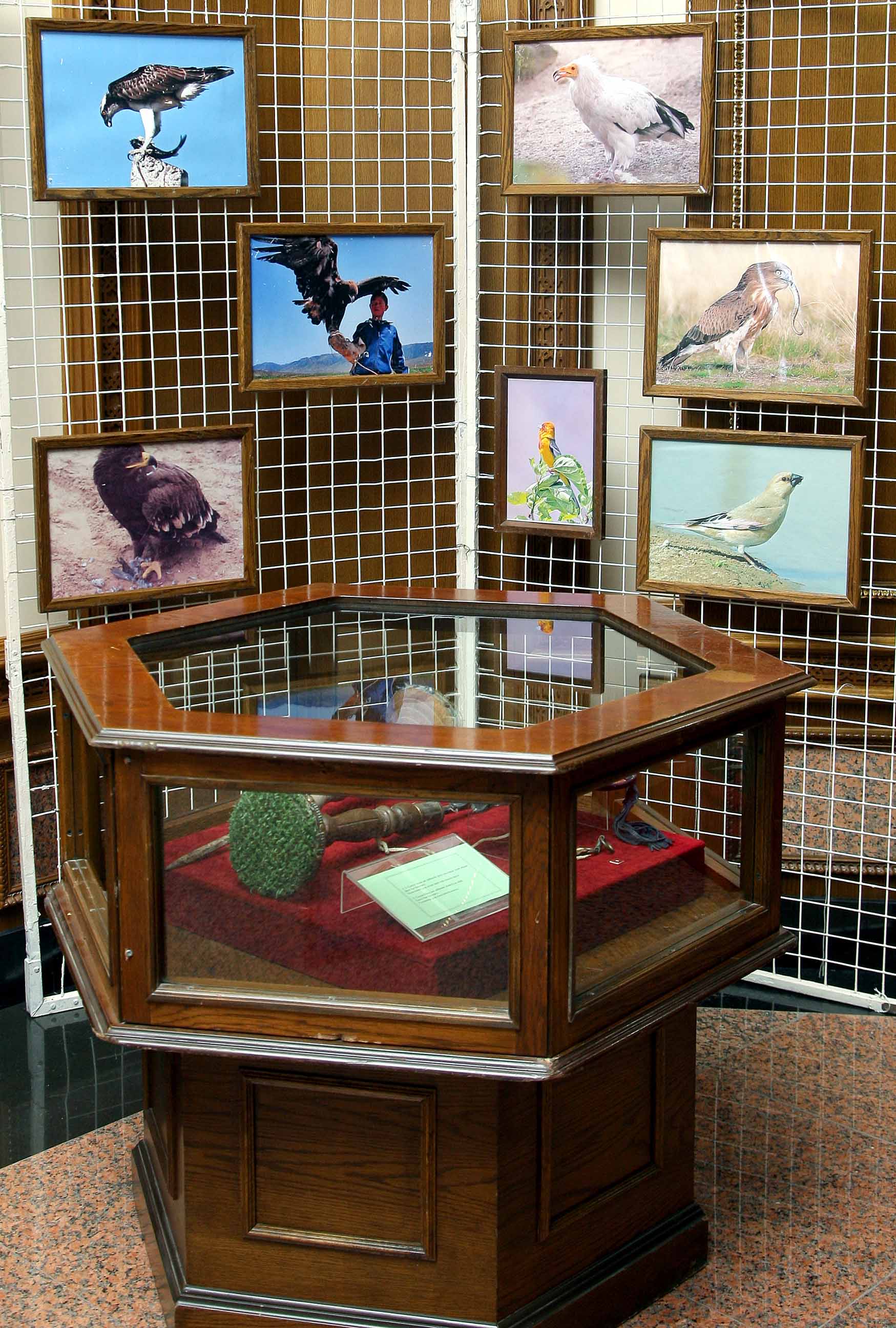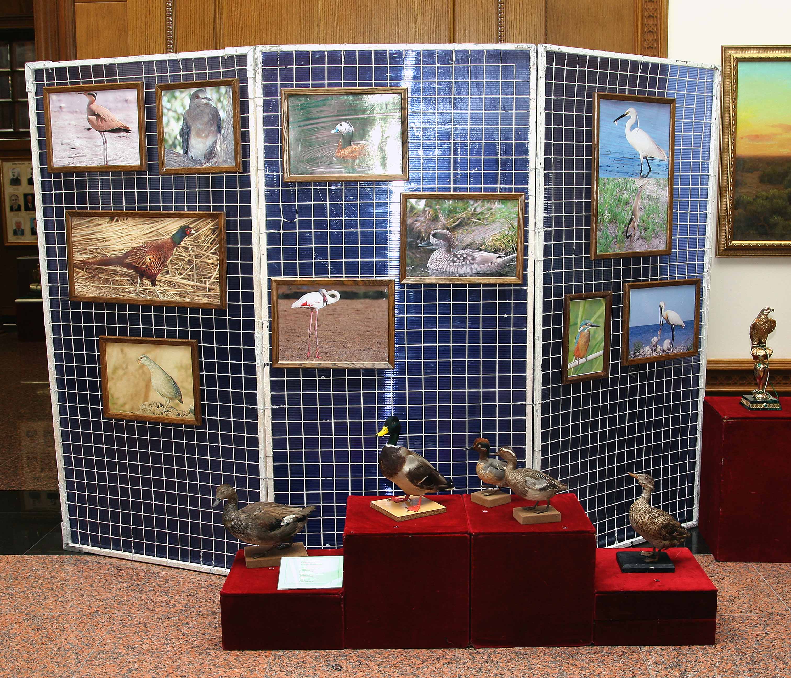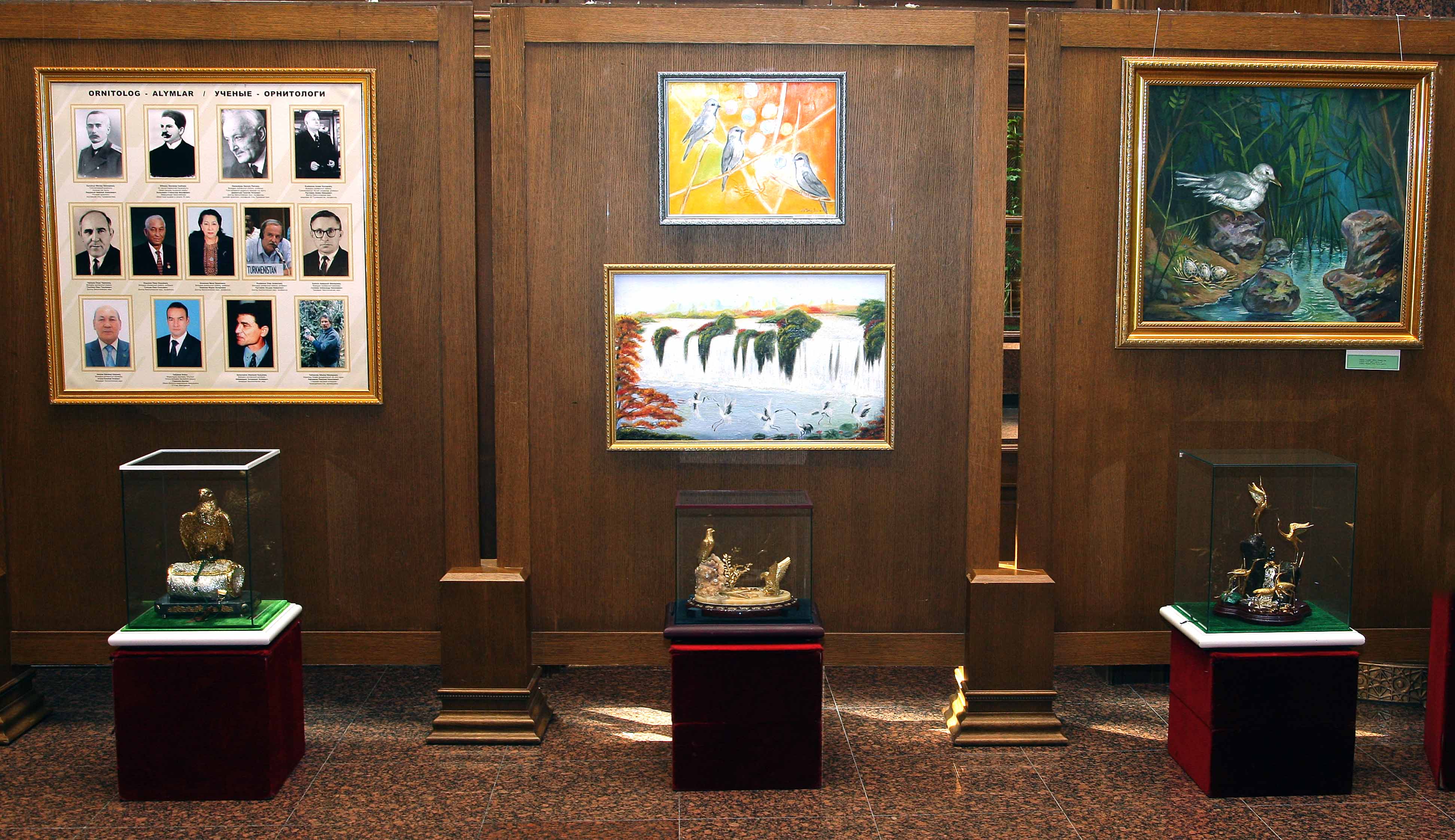 Затем уважаемых гостей ознакомили с выставкой птиц, встречающихся в Туркменистане, их многообразием и красотой. Были представлены ценные музейные экспонаты – чучела птиц, их яйца, гнезда, также полотна художников, скульптурные статуэтки, картины, ковровые панно, фотографии с изображением пернатых. Много места уделено научной и художественной литературе, красочным журналам о птицах и портретам известных ученых-орнитологов Туркменистана. В этом году большим подарком музею стали дневники известного орнитолога, профессора МГУ Г.П. Дементьева, работавшего в годы войны на территории Туркменистана. На выставке были впервые продемонстрированы эти бесценные документы, которые любезно передал в дар музею доктор биологических наук, профессор Э.А. Рустамов – видный орнитолог Туркменистана.