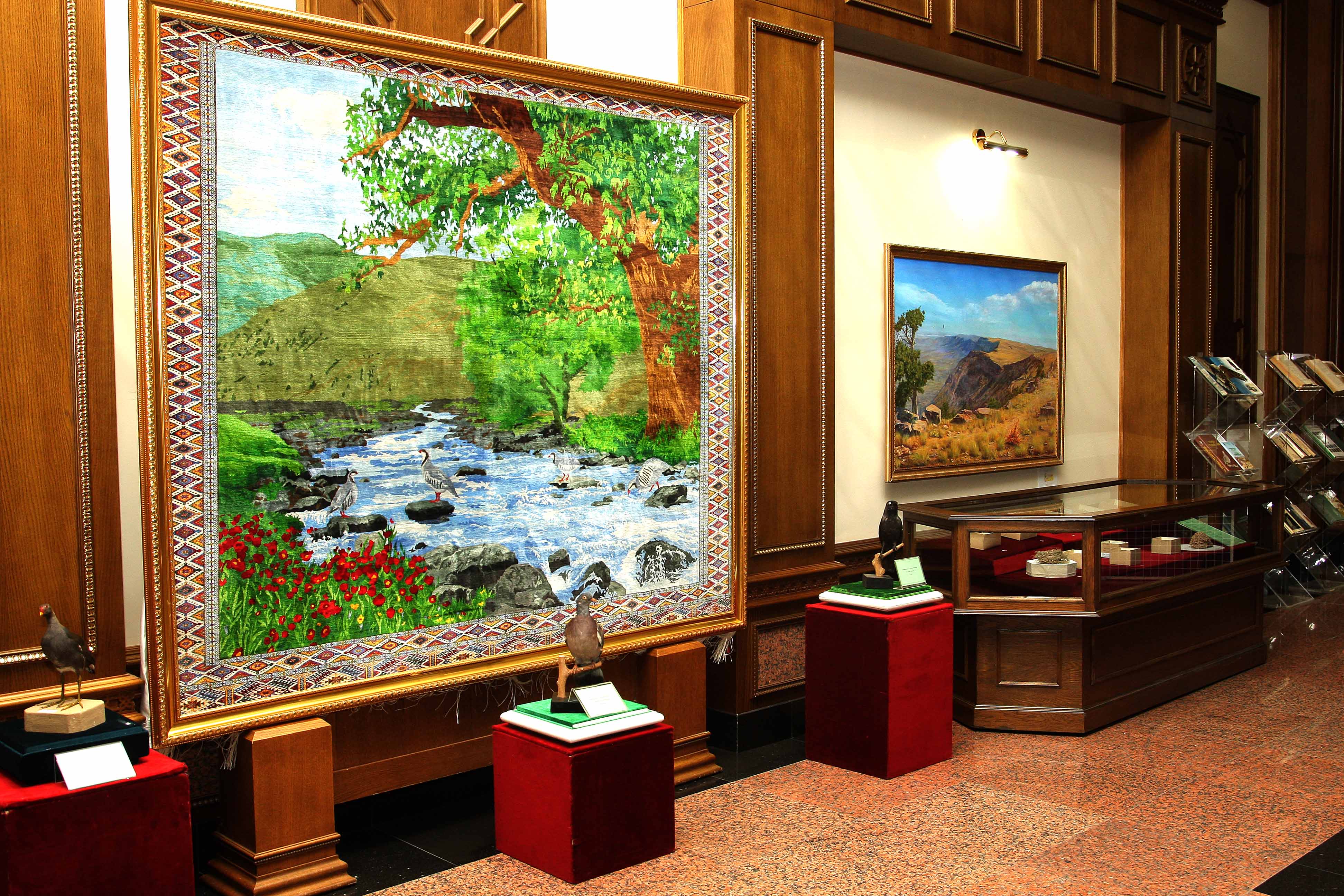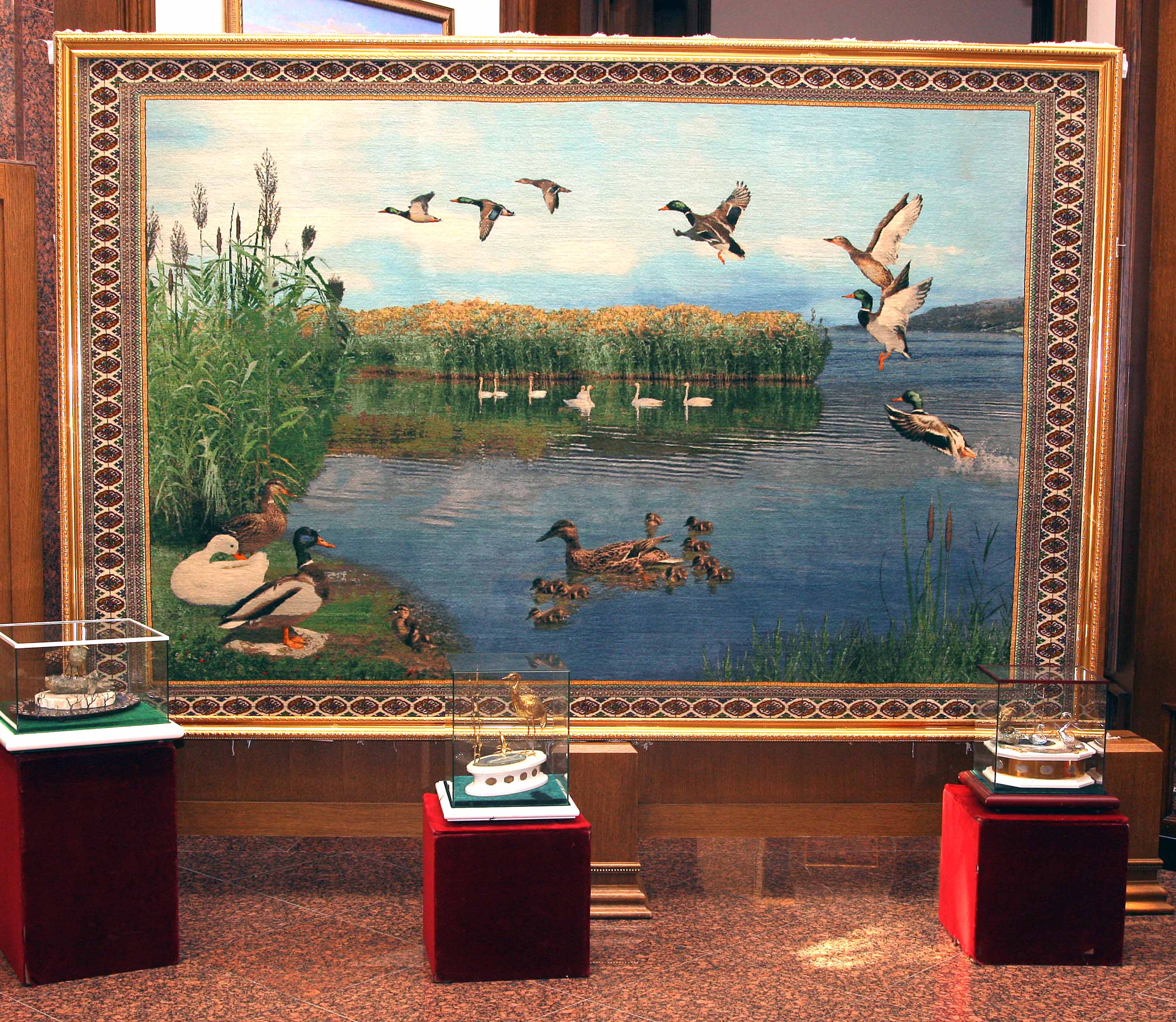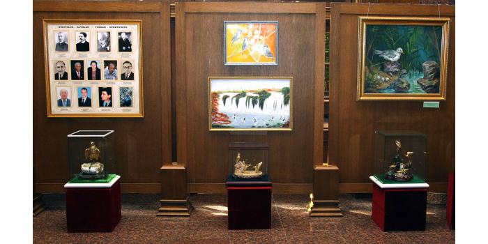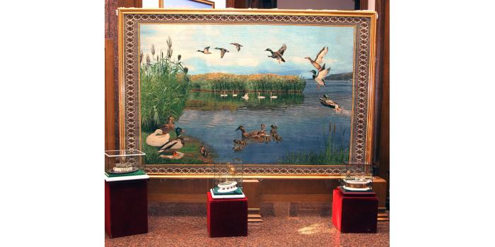 Затем уважаемых гостей ознакомили с выставкой птиц, встречающихся в Туркменистане, их многообразием и красотой. Были представлены ценные музейные экспонаты – чучела птиц, их яйца, гнезда, также полотна художников, скульптурные статуэтки, картины, ковровые панно, фотографии с изображением пернатых. Много места уделено научной и художественной литературе, красочным журналам о птицах и портретам известных ученых-орнитологов Туркменистана. В этом году большим подарком музею стали дневники известного орнитолога, профессора МГУ Г.П. Дементьева, работавшего в годы войны на территории Туркменистана. На выставке были впервые продемонстрированы эти бесценные документы, которые любезно передал в дар музею доктор биологических наук, профессор Э.А. Рустамов – видный орнитолог Туркменистана.
