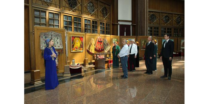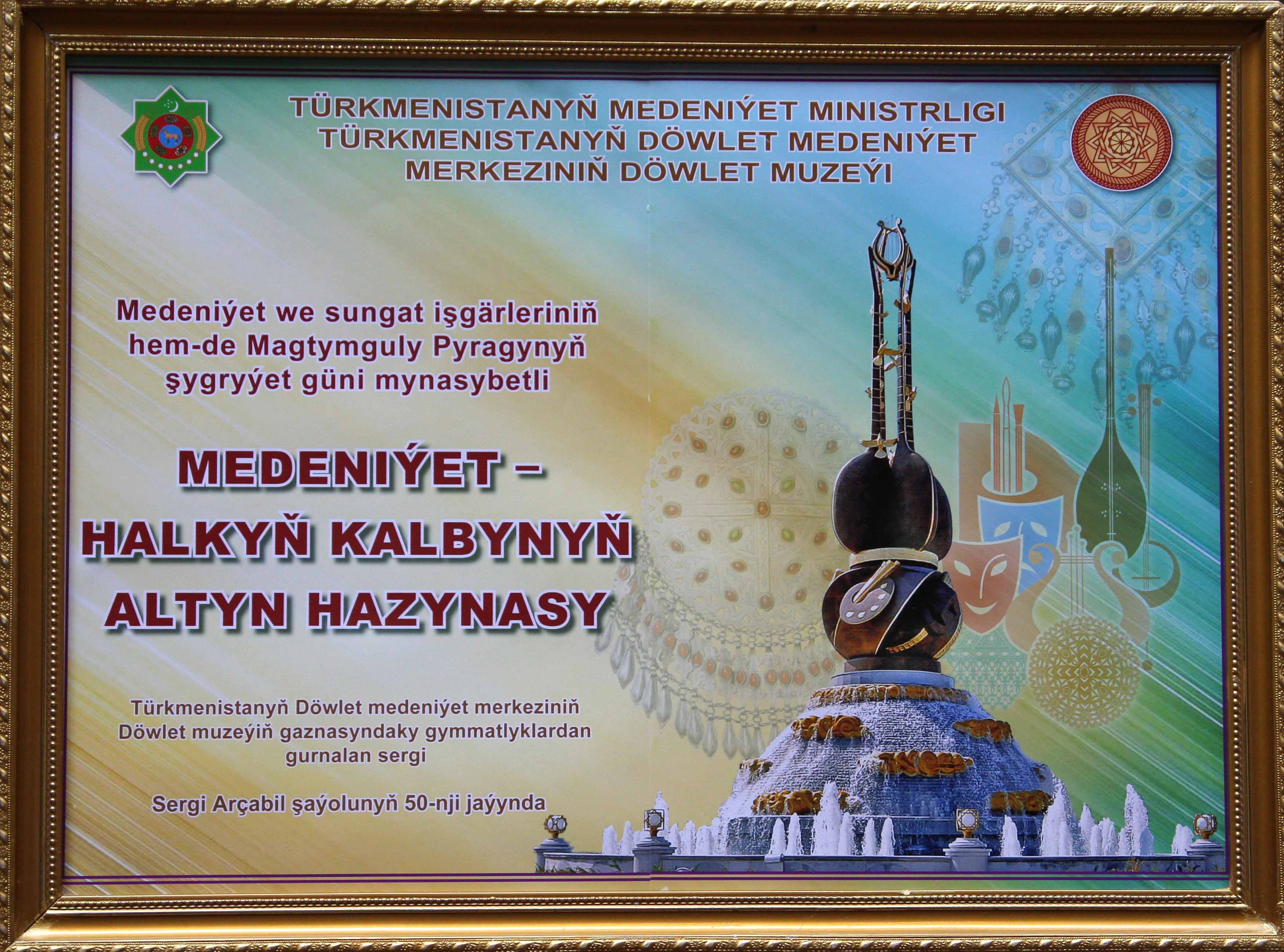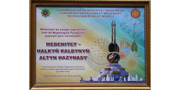 В честь дня работников культуры и искусства, а также поэзии Махтумкули Фраги в Государственном музее Государственного культурного центра Туркменистана организована выставка под названием “Культура – золотая сокровищница души народа”. Выставка открывается мудрыми словами уважаемого Президента о культуре и искусстве и эмблемой года. Также на выставке представлены произведения художников Г.Tораева “Kуняургенч”, Г.Нурлыева “Aстaнa-бaбa”, “Султан Санджар”, “Мавзолей Ширкебир”, “Ювелир”, олицетворяющие исторические памятники Meрв, Хорезм, Дехистан, а также глиняная посуда, глазурованные кувшины, светильник. В ходе выставки расположены произведения Народного художника Туркменистана Ч. Aмангельдыева “Родогуна”, а также молодых художников Г.Язмухаммедовой “Национальные ценности”, Ш.Реджепова “Древнее ремесло”.