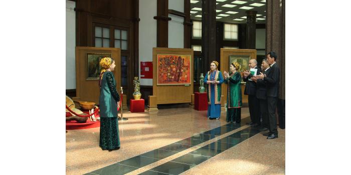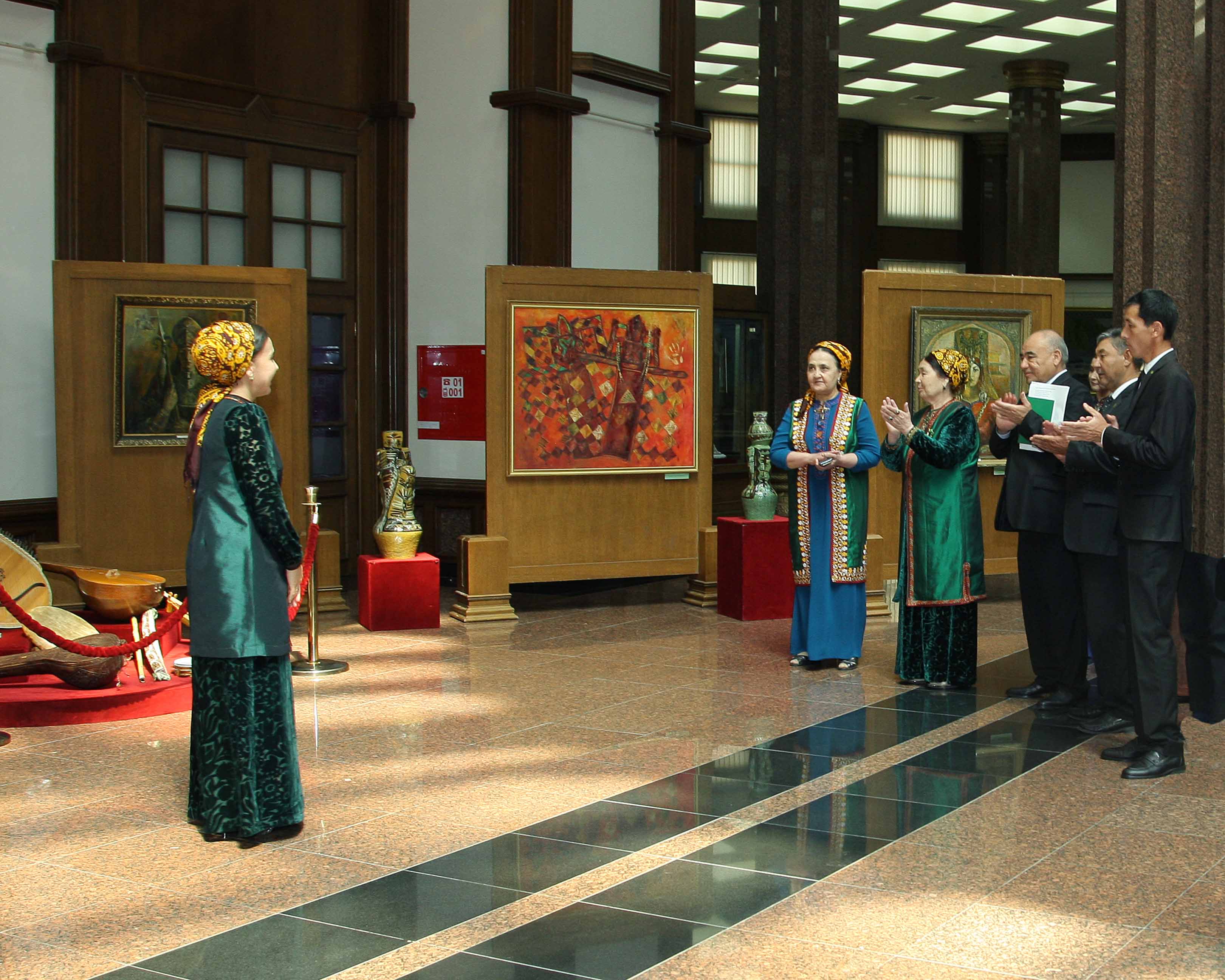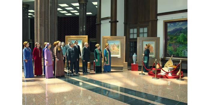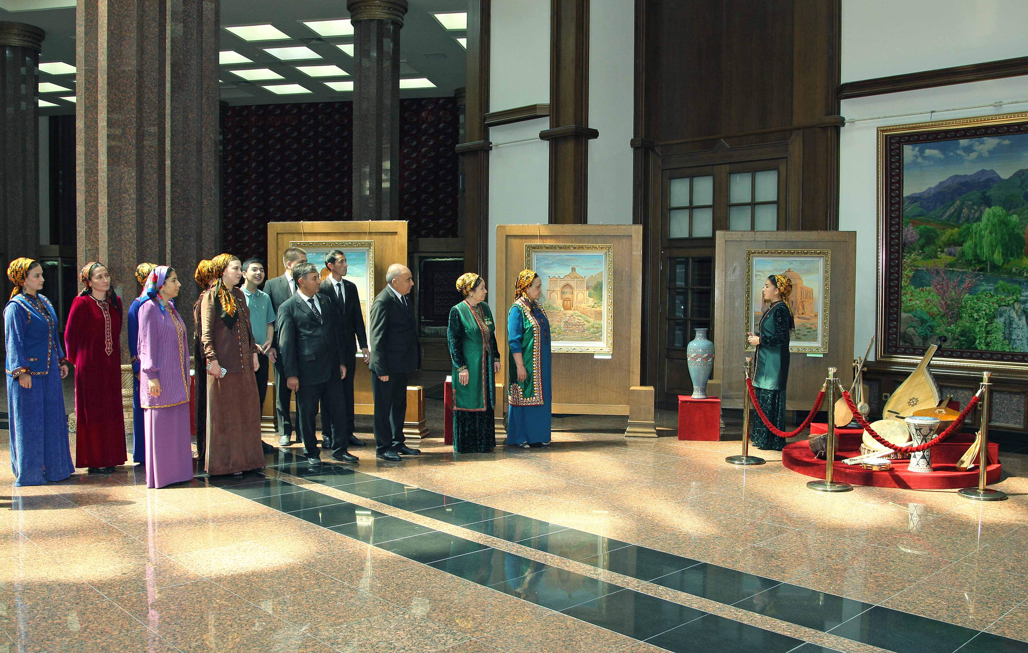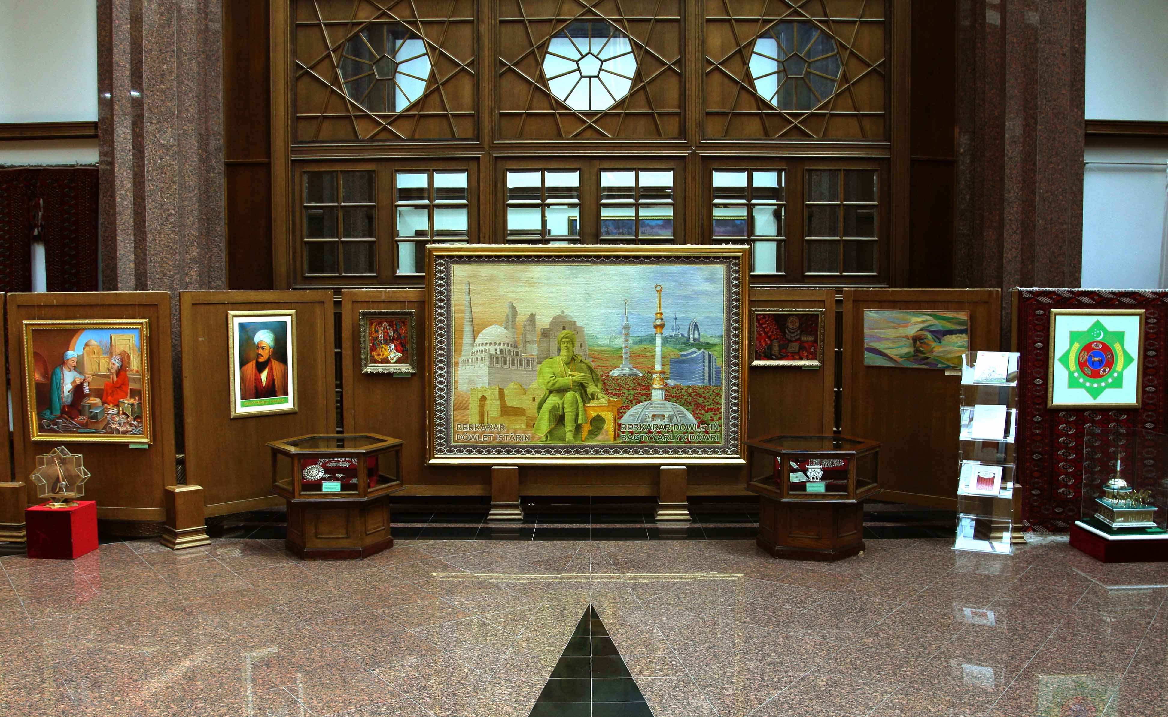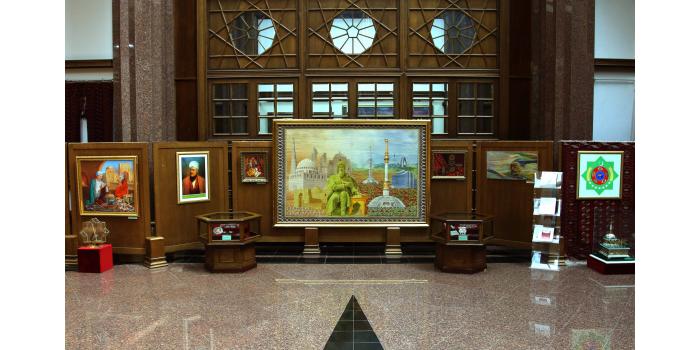 На выставке свое место нашли произведения Г.Tораева «Kуняургенч», Г.Нурлыева «Султан Санджар», «Мавзолей Ширкебир» «Мавзолей Mяне баба», воспевающие древние памятники, а также произведения Народного художника Туркменистана Ч.Aмaнгельдыева «Родогуна» и «Toмирис». Также здесь представлены элитарные ценности дутар, гиджак, свирель, бубен, являющиеся частью 72 музыкальных инструментов, украшающих праздники туркменского народа.