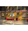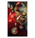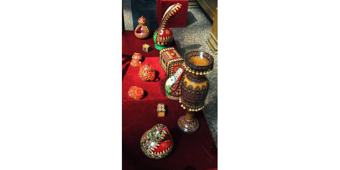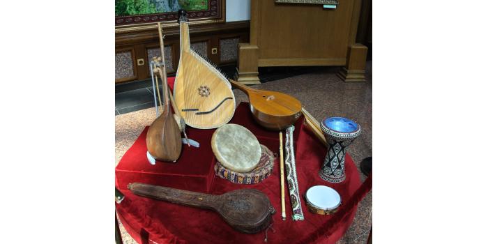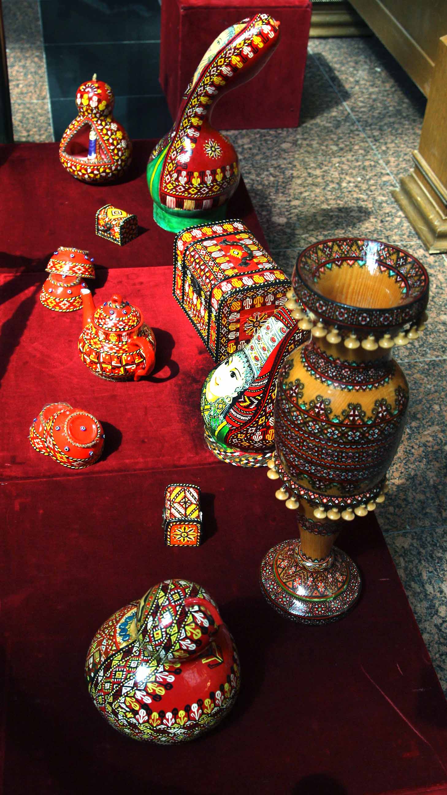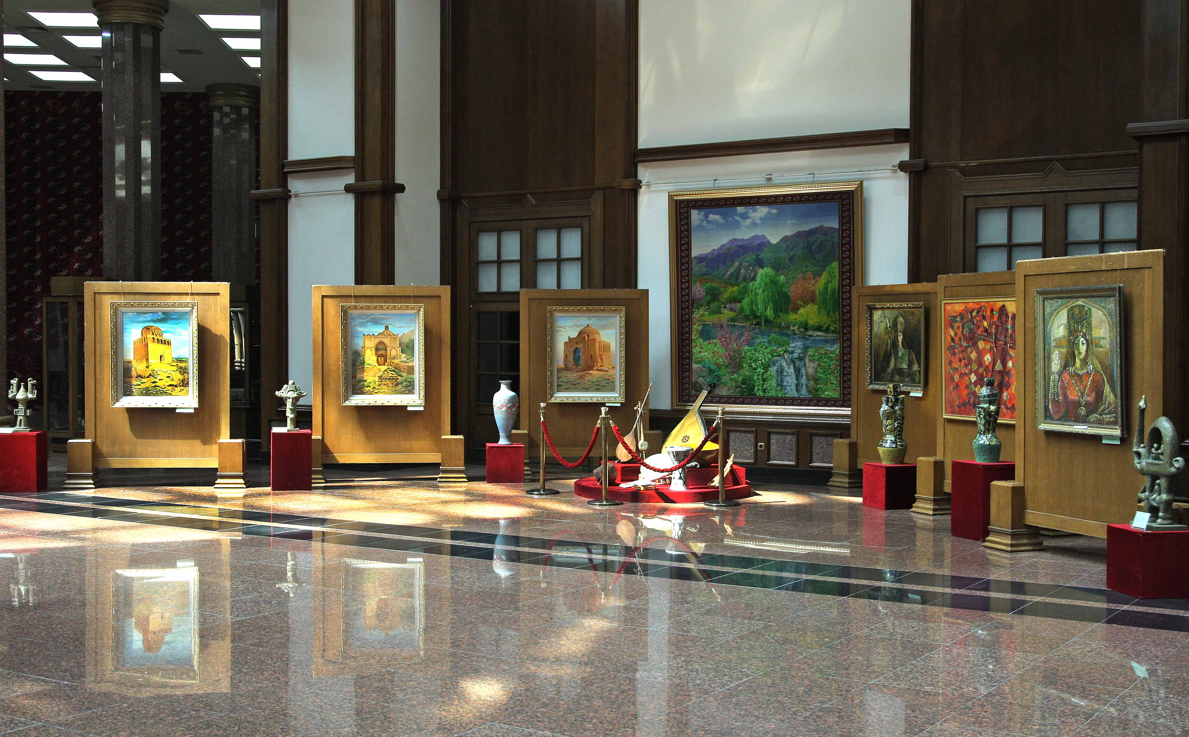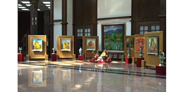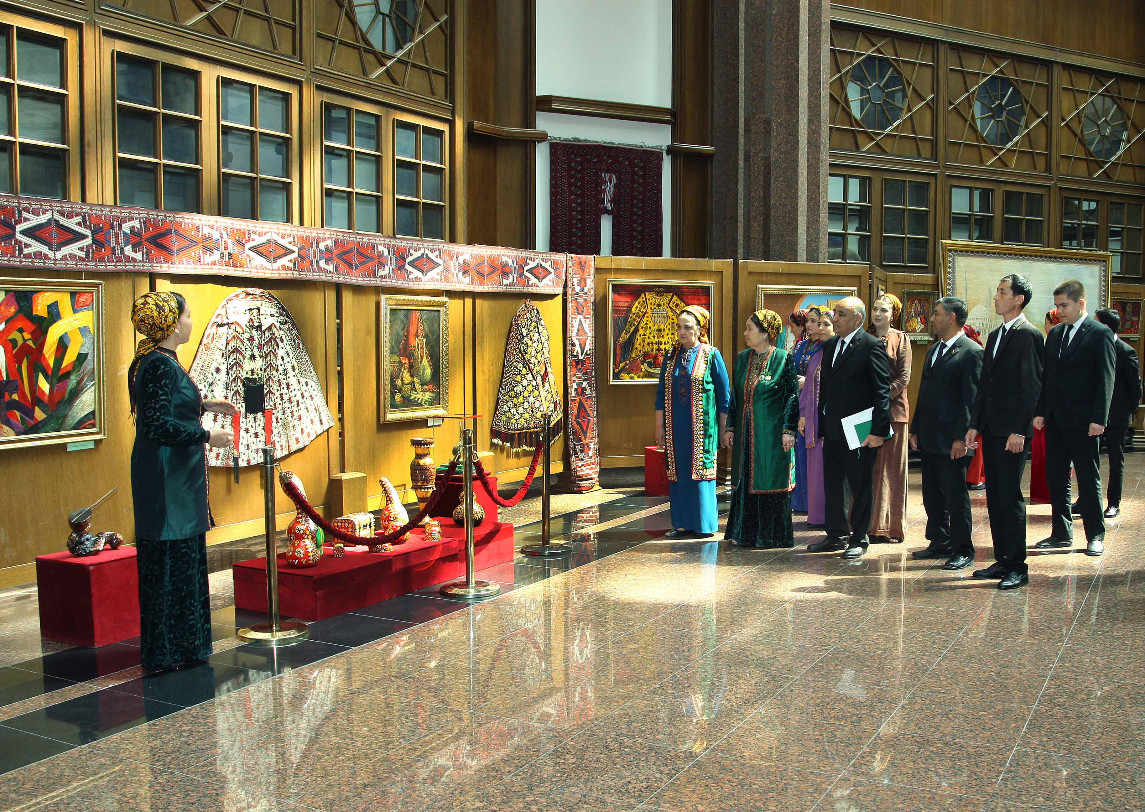 На выставке свое место нашли произведения Г.Tораева «Kуняургенч», Г.Нурлыева «Султан Санджар», «Мавзолей Ширкебир» «Мавзолей Mяне баба», воспевающие древние памятники, а также произведения Народного художника Туркменистана Ч.Aмaнгельдыева «Родогуна» и «Toмирис». Также здесь представлены элитарные ценности дутар, гиджак, свирель, бубен, являющиеся частью 72 музыкальных инструментов, украшающих праздники туркменского народа.