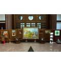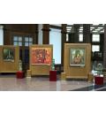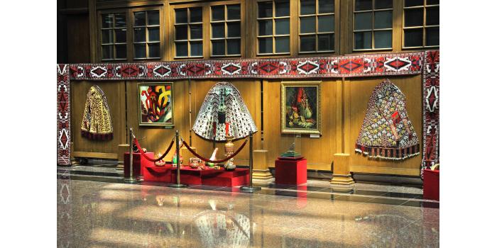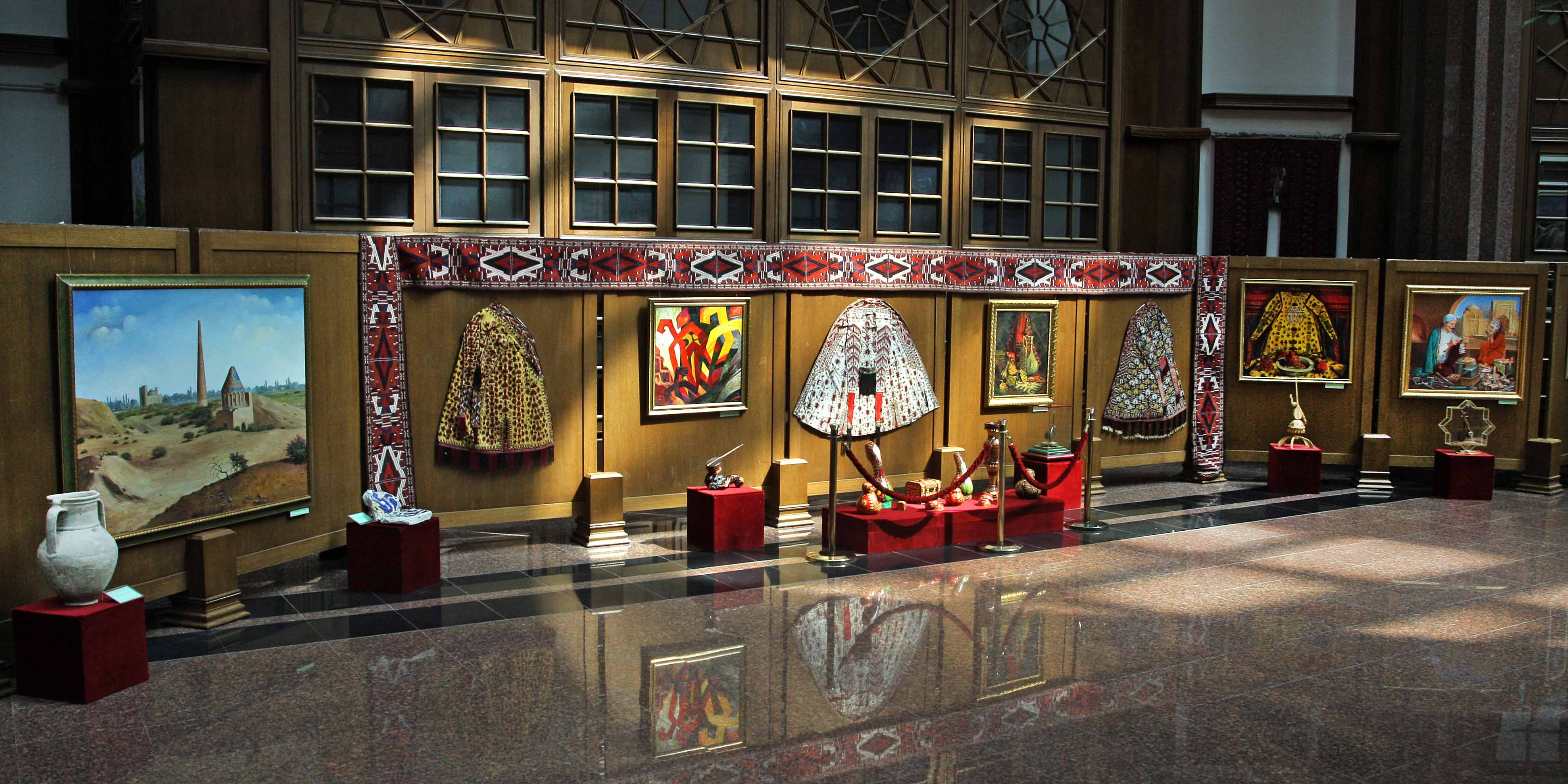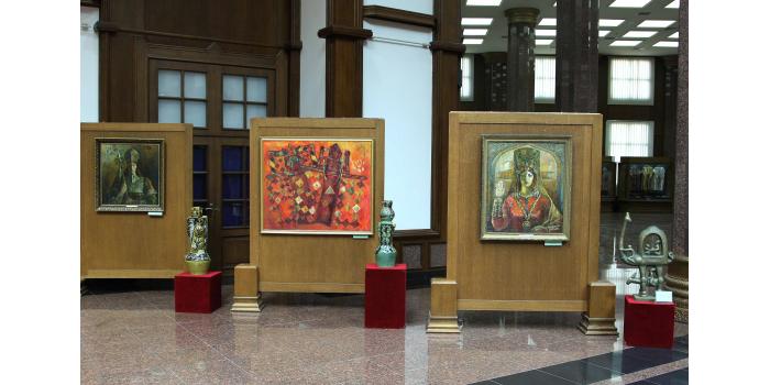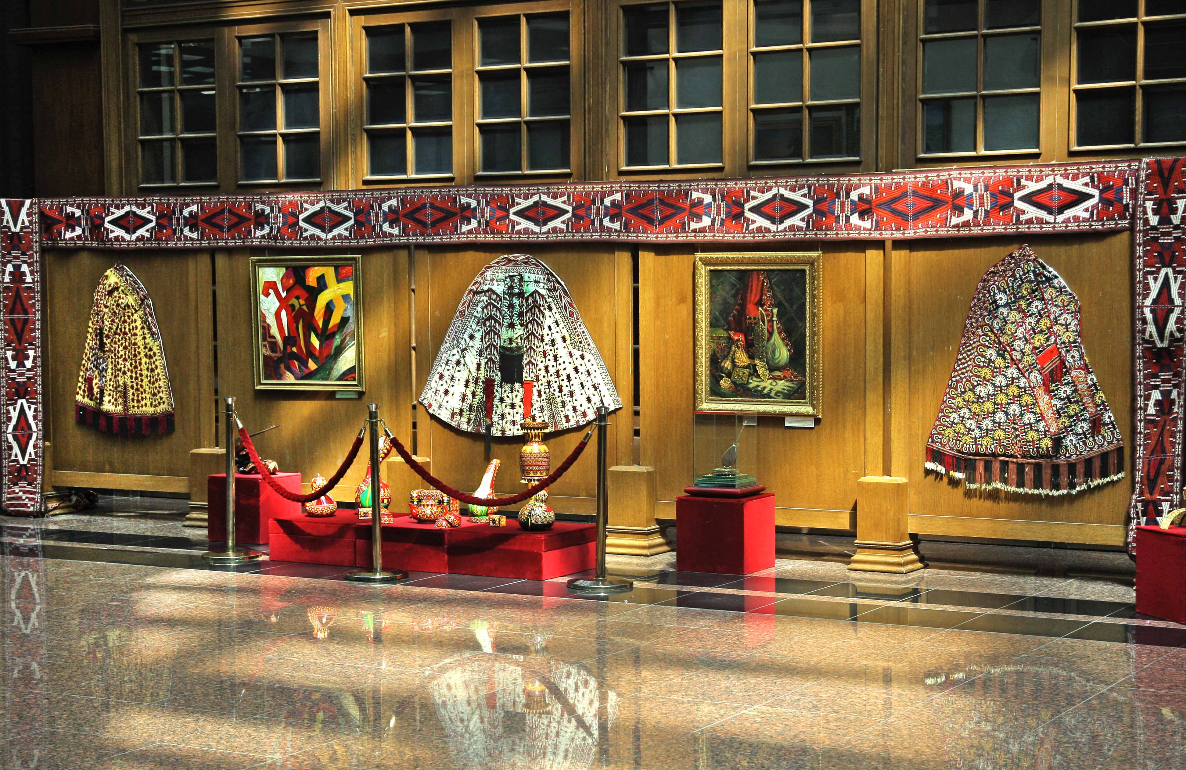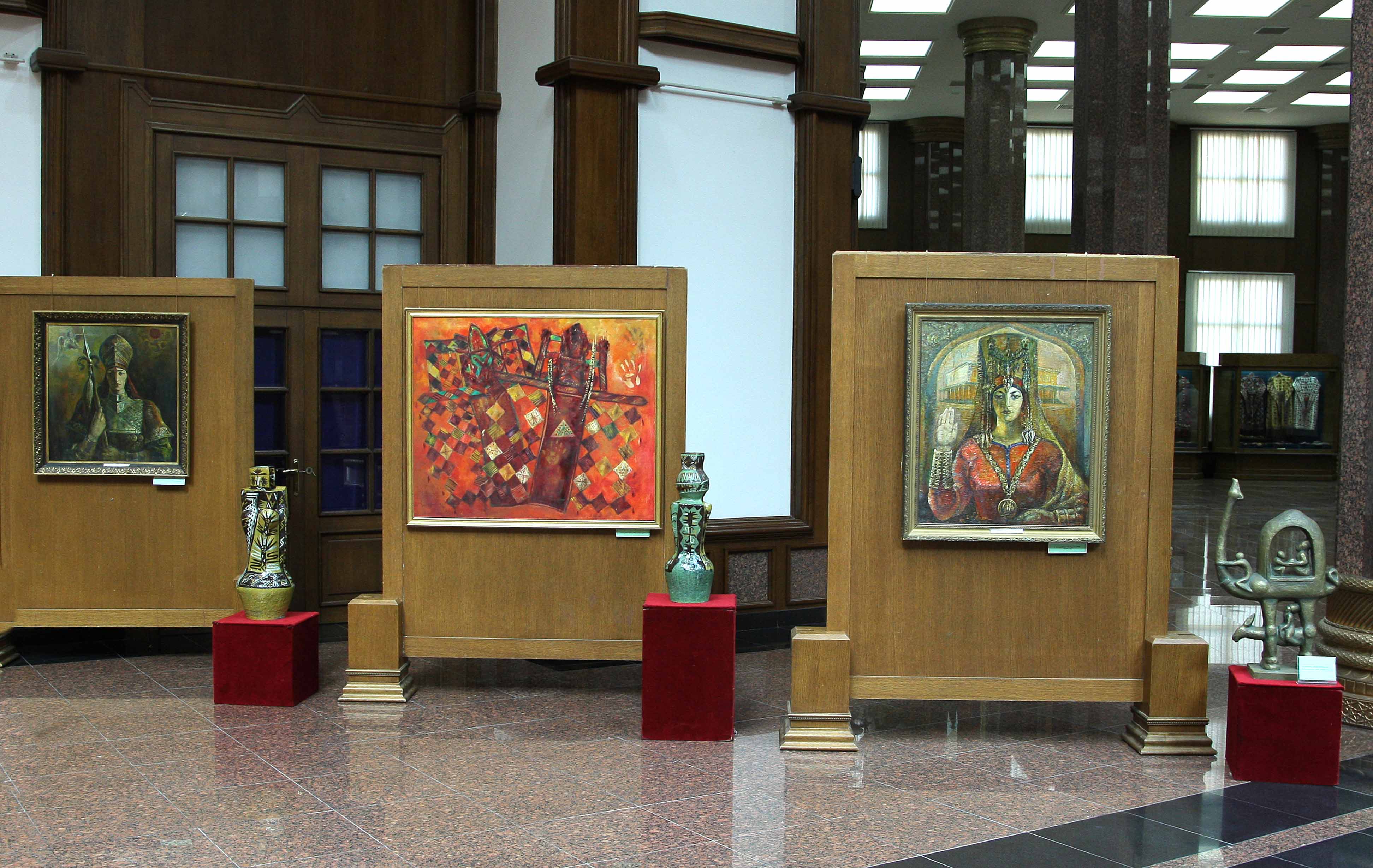 Зеленые, желтые, белые накидки, вышитые умелыми руками женщин сочетаются с картинами известных художников В. Майковского «Taнец», Н. Бекназарова «Гранаты» и A.Чаканова «Блики национального наследия».
