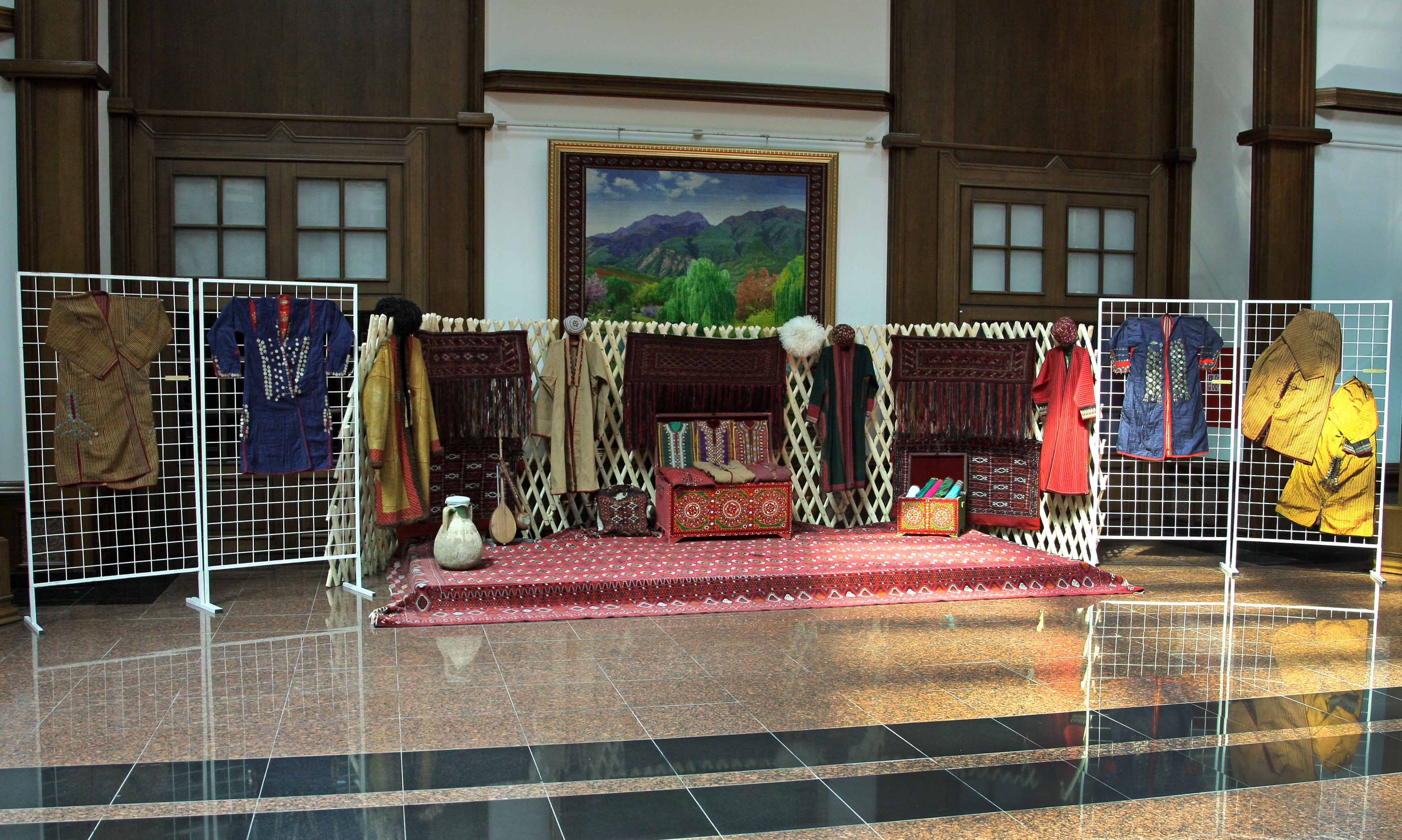 Sergide zenanlar tarapyndan geýilen el keşdeli, basma nagyşlar bilen bezelen begresler, keşdelenen we kümüş bezegli çabytlar, kümüş düwmeler we teňňe pisint kümüş bölejikler, bugnama hem-de mata bölejikleri bilen haşamlanan mahmal we küleçe donlary, gyzyl ýaşyl zolakly dokalan sary tagta donlar, ilme nagyşly mawut we baş donlar, içi pagtalanyp syralan hywa donlar, pugtalanyp bezelen çepbetöw, daraýy we maldaýy donlar hem-de erkek adamlar tarapyndan geýilen gyrmyzy don, garma don, hywa don, düýe we goýun ýüňünden dokalan agar hem-de çal çäkmenleriň ajaýyp görnüşleri görkezilýär.