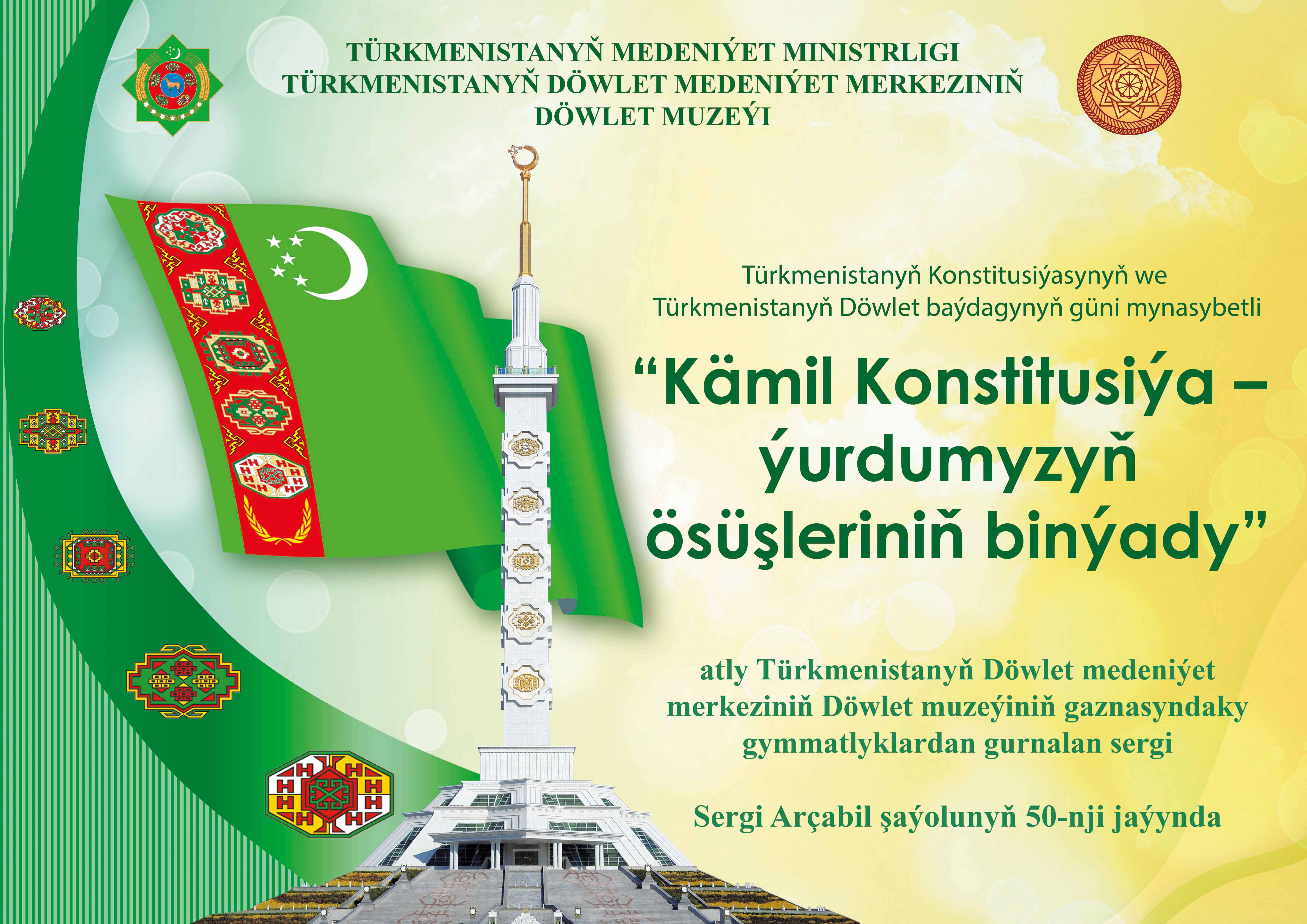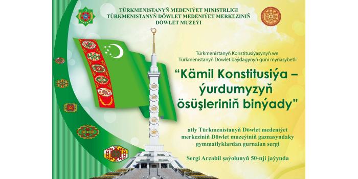 The State museum of the State cultural centre of Turkmenistan invites those, who wishes to the inauguration of the exhibition named “Perfect Constitution – creation of progress of the country” dedicated to the Turkmenistan Constitution Day and Day of the State flag of Turkmenistan, which will be held on the 15th of May 2024 at 11 o’clock a.m. Our address: Archabil avenue – 50 Phone: 48-25-92