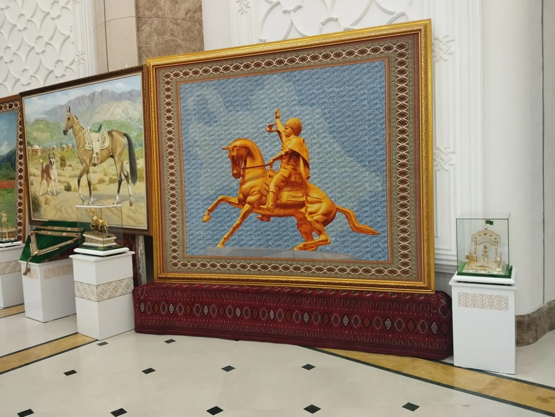 As is known, the National Leader of the Turkmen people, Chairman of Halk Maslahaty of Turkmenistan Hero Arkadag in January was on a visit to the Principality of Monaco. The same days «Galkynyş» group of national horse games having successfully acted at 47th International festival of a circus art in Monte Carlo city of the Principality of Monaco, has been awarded the Gold cup and other special prizes. It became a bright evidence of the fact that on the initiative of the National Leader and due to the care of the honourable President the circus art of the country is led on the world level. In honour of this joyful occasion on the1st of February 2025 in Arkadag city have been carried out solemn events. The celebration have started on the square in front of «Akhan» monument of Arkadag city. Here have sounded songs sung by workers of art and culture. Participants of «Galkynyş» group of national horse games have come to the Gorogly State horse circus of Arkadag city of along Аkhan and Aba Аnnаеv avenues. Here they have been met and congratulated with success by honourable elders, horse breeder-instructors and there has taken also place the ceremony of their rewarding. Within the framework of the celebrations organized in Arkadag city has been made an exhibition dedicated to the last successes of «Galkynyş» group of national horse games. At the entry the Gorogly State horse circus has been also organized an exhibition of national values. At this exhibition have been presented exhibits from storehouses of the State museum of the State cultural centre of Turkmenistan. The special place at the exhibition has been given to the values concerning a Turkmen horse. After finding of Independence, in the work of protection of the national heritage and its enrichment the look on national carpets was filled with the new maintenance. Our skilful carpet makers are not limited with weaving of national patterns, they pay special attention to the weaving of carpets with the picture of the horses, which are the pride of the Turkmen people. The sufficient place is given to carpet pictures with the woven «Akhan» and «Arkadag» monuments. There are also exposed horse adornments. Here are also demonstrated jewellery compositions, harness and figurines.