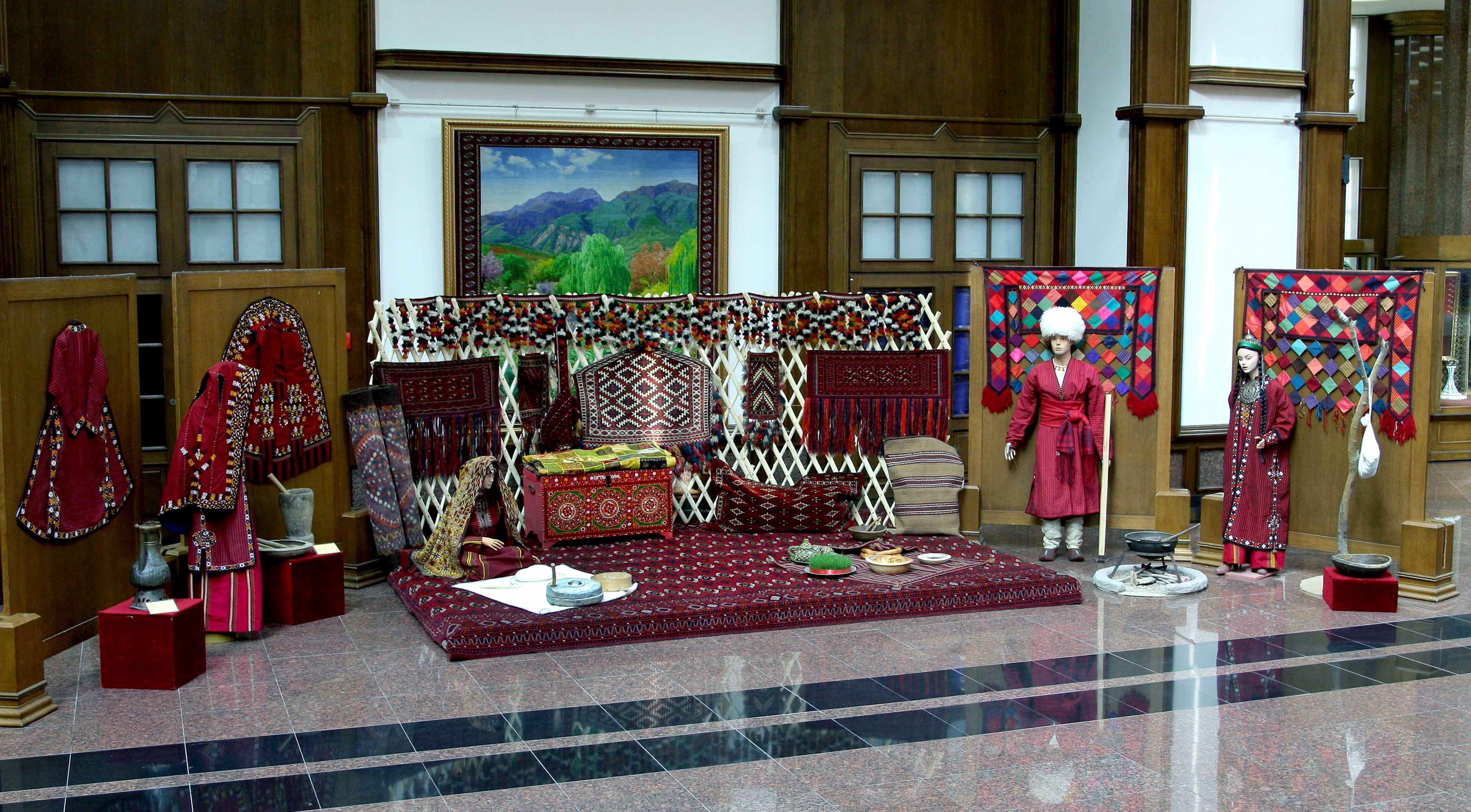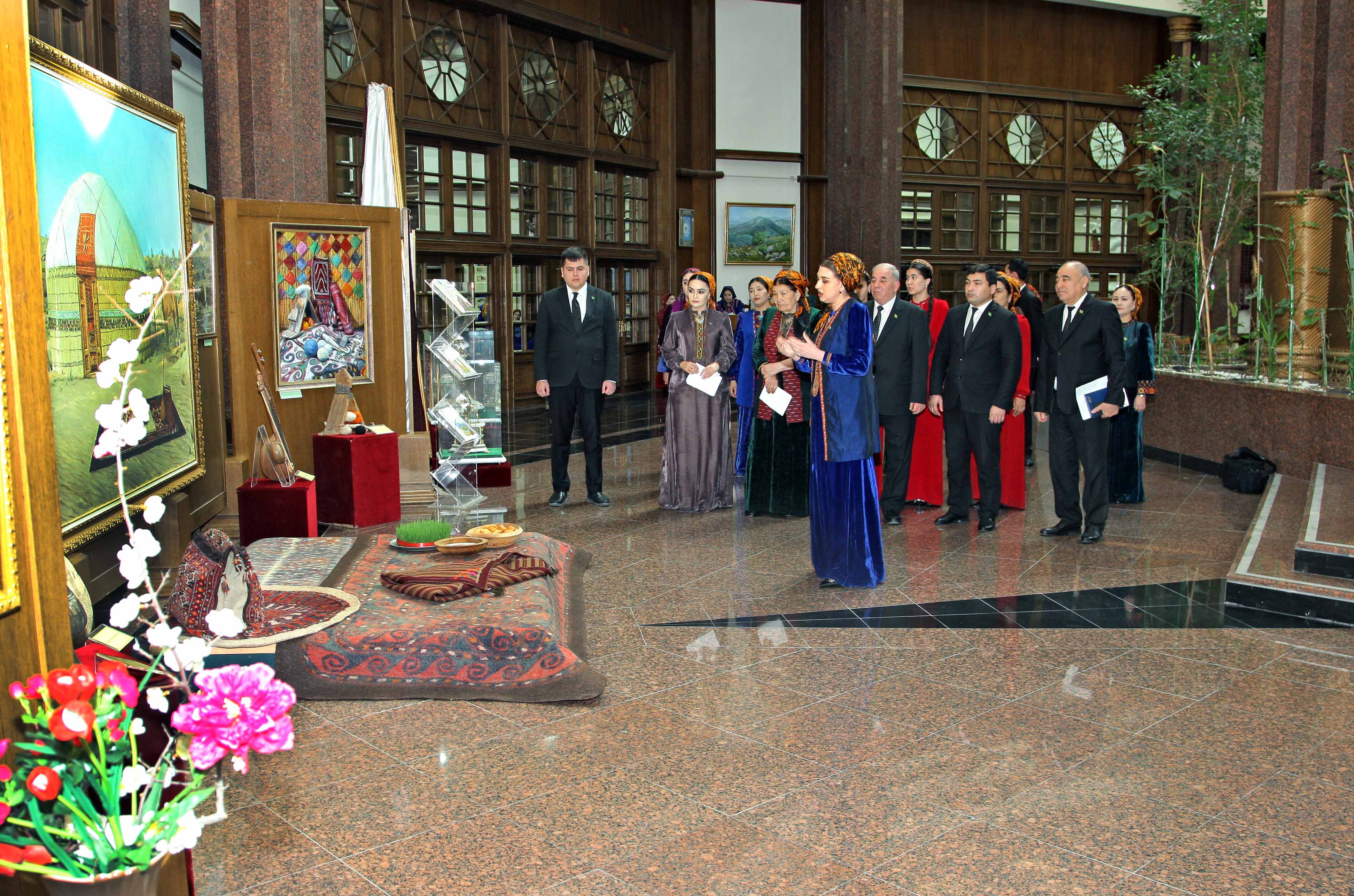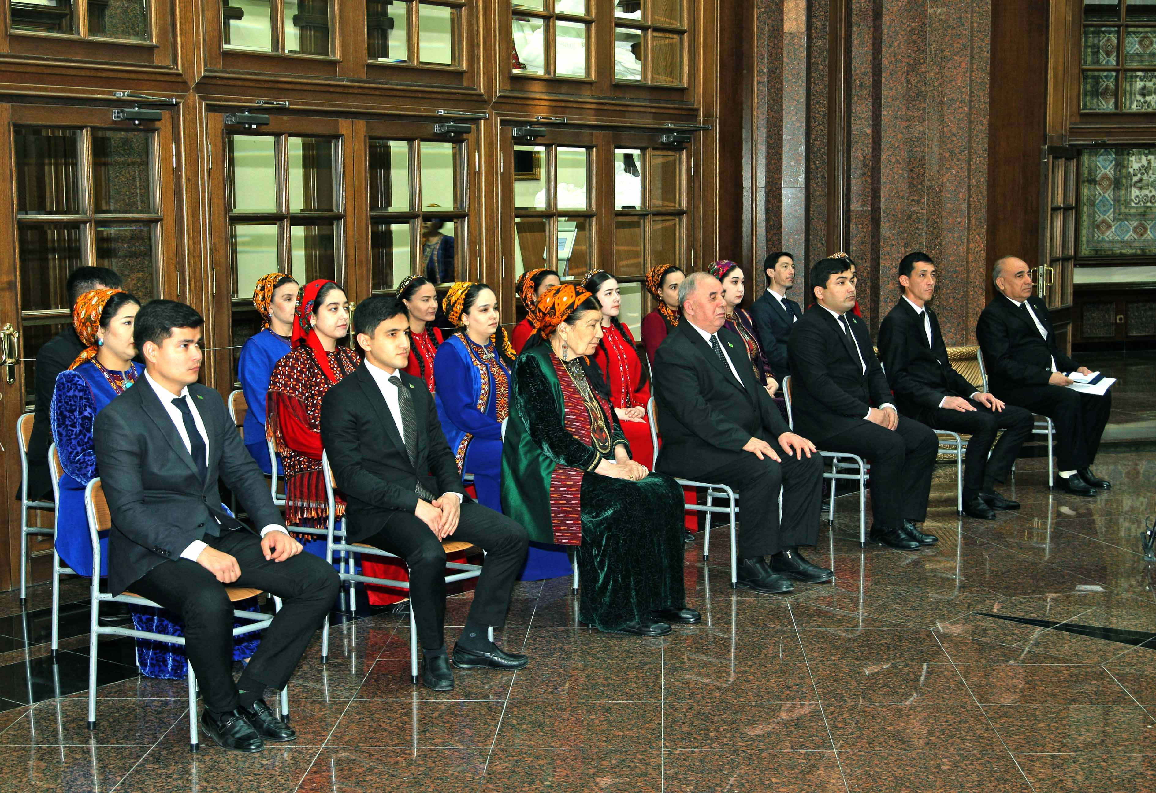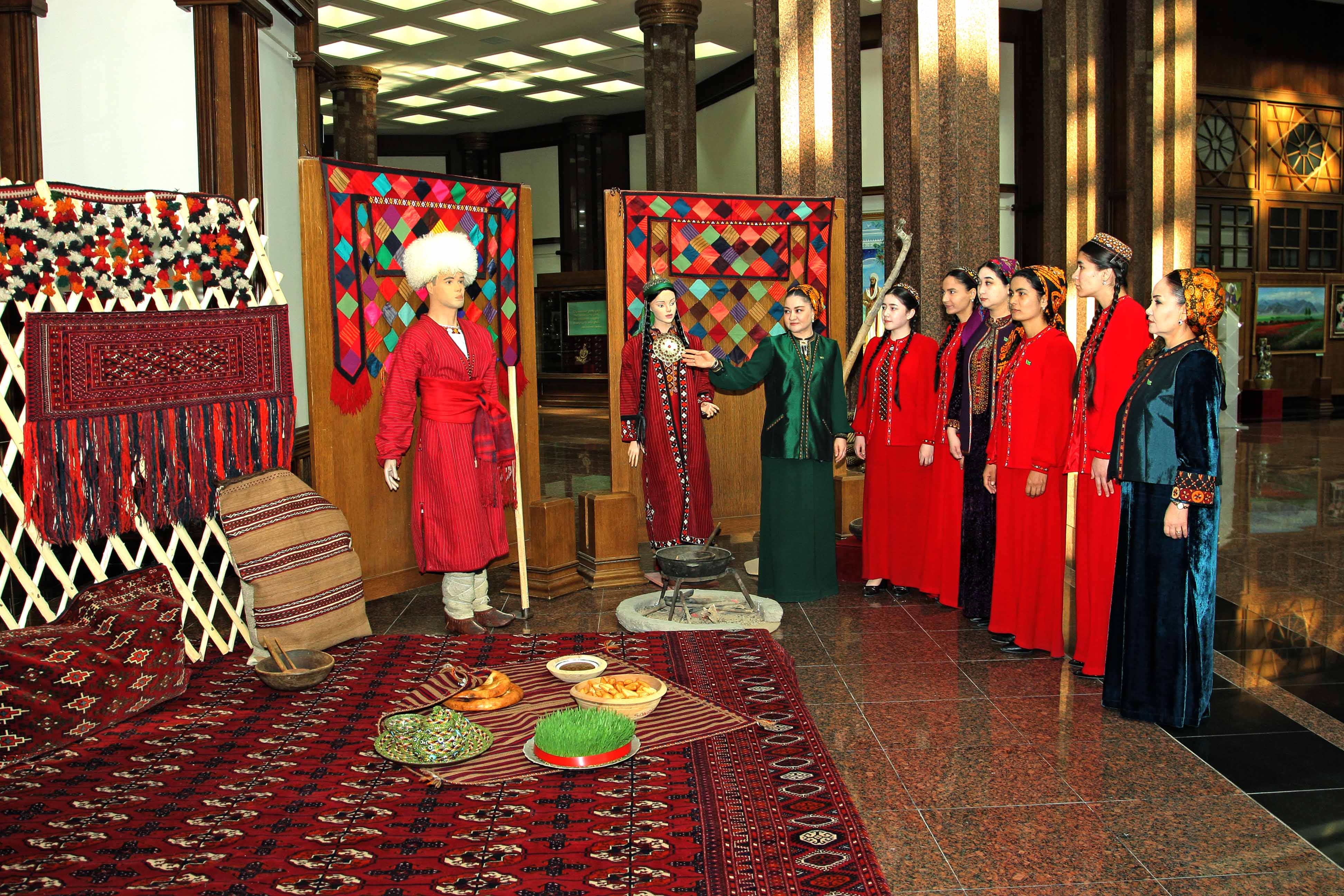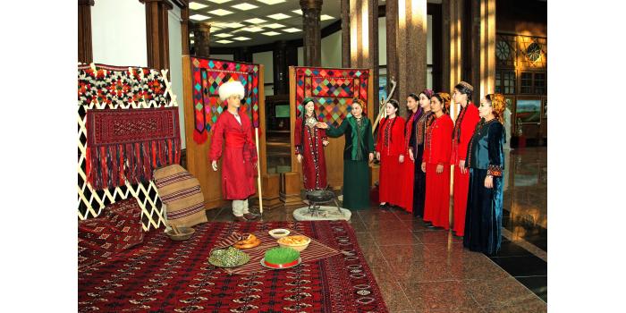 At the era of Revival of a new epoch of the powerful state, in “The International year of peace and trust” in all the parts of our country in honour of International Novruz holiday on spring lawns with enthusiasm are developed various musical celebrations, performances of folklore ensembles and national games. Along with it at the State museum of the State cultural centre of Turkmenistan in honour of the International spring Novruz holiday is organized an exhibition named “Motion of the new day". At the exhibition are presented classical values well-known for their beauty, magnificence and grace. Besides it, in a prominent place are located the works of artists glorifying beauty of Turkmen spring, the jewellery made at the higher art level, the national costumes decorated with a fine embroidery. Products of national workmanship dutar and gidjak, articles of everyday use are offered to the attention of visitors. Original harmony create the carpets pictures personifying the Turkmen nature, the pastures covered with green grass, fields of poppies and animal world. In the course of the exhibition is also possible to see a mannequin in the national woman's wear, milling a flour before tarim, decorated with carpets and carpet products, and messengers of Novruz holiday sprouted spikelets of wheat, national food pishme and a semeni, increasing a celebratory shade. The exhibition was opened by the senior research fellow of the museum of the President of Turkmenistan of the State museum of the State cultural centre of Turkmenistan Jahan Nazarova. Then the floor was given to the Honoured cultural worker of Turkmenistan, poetess Oguljemal Charyeva, People’s writer of Turkmenistan Dovletgeldi Annamyradov, senior teacher of Turkmen State art and culture college Jumaberdi Artykow, student of the Academy of the State service near the President of Turkmenistan Garahanjar Baikhanov and student of the Turkmen State medical institute Nursoltan Derуaeva.