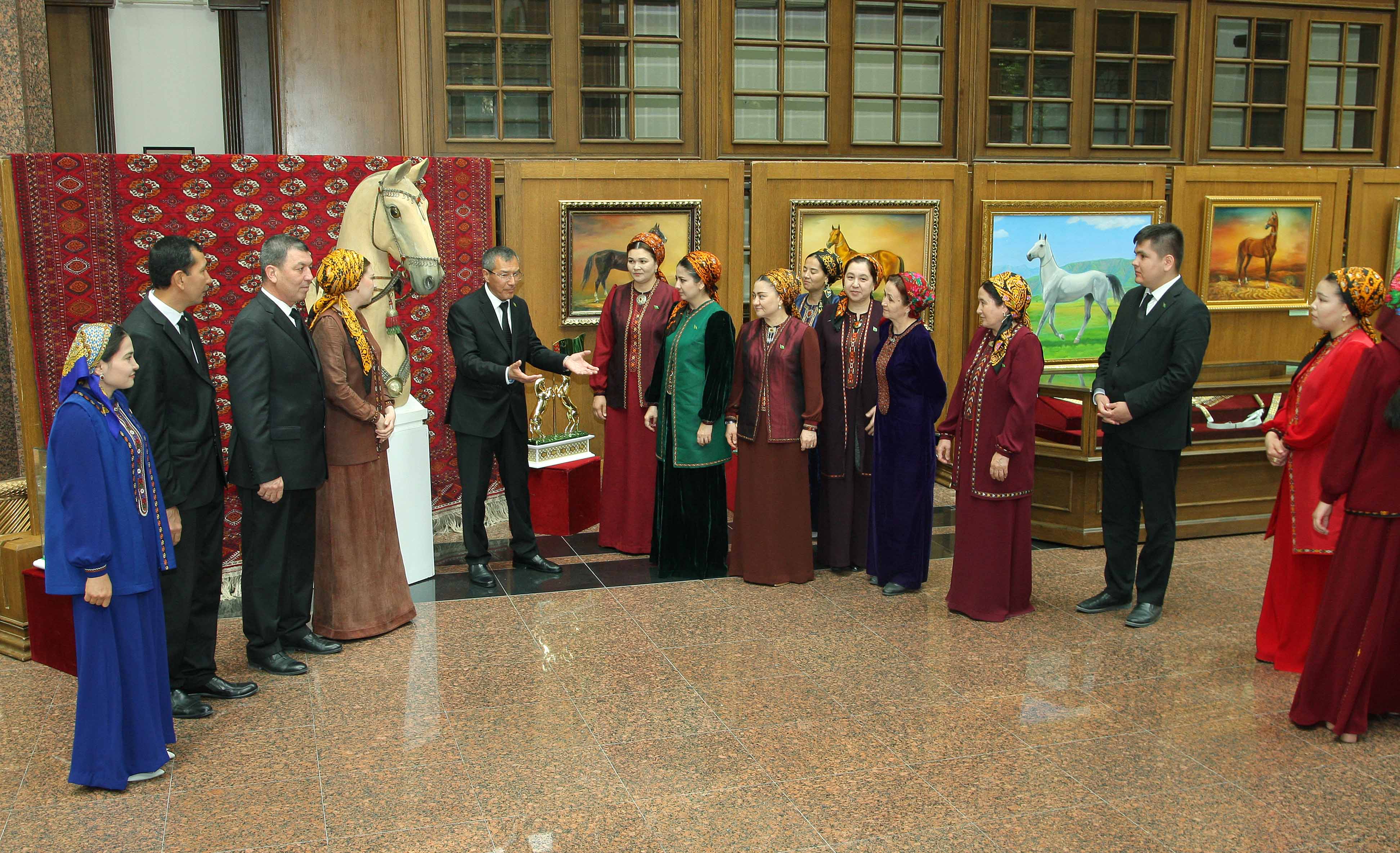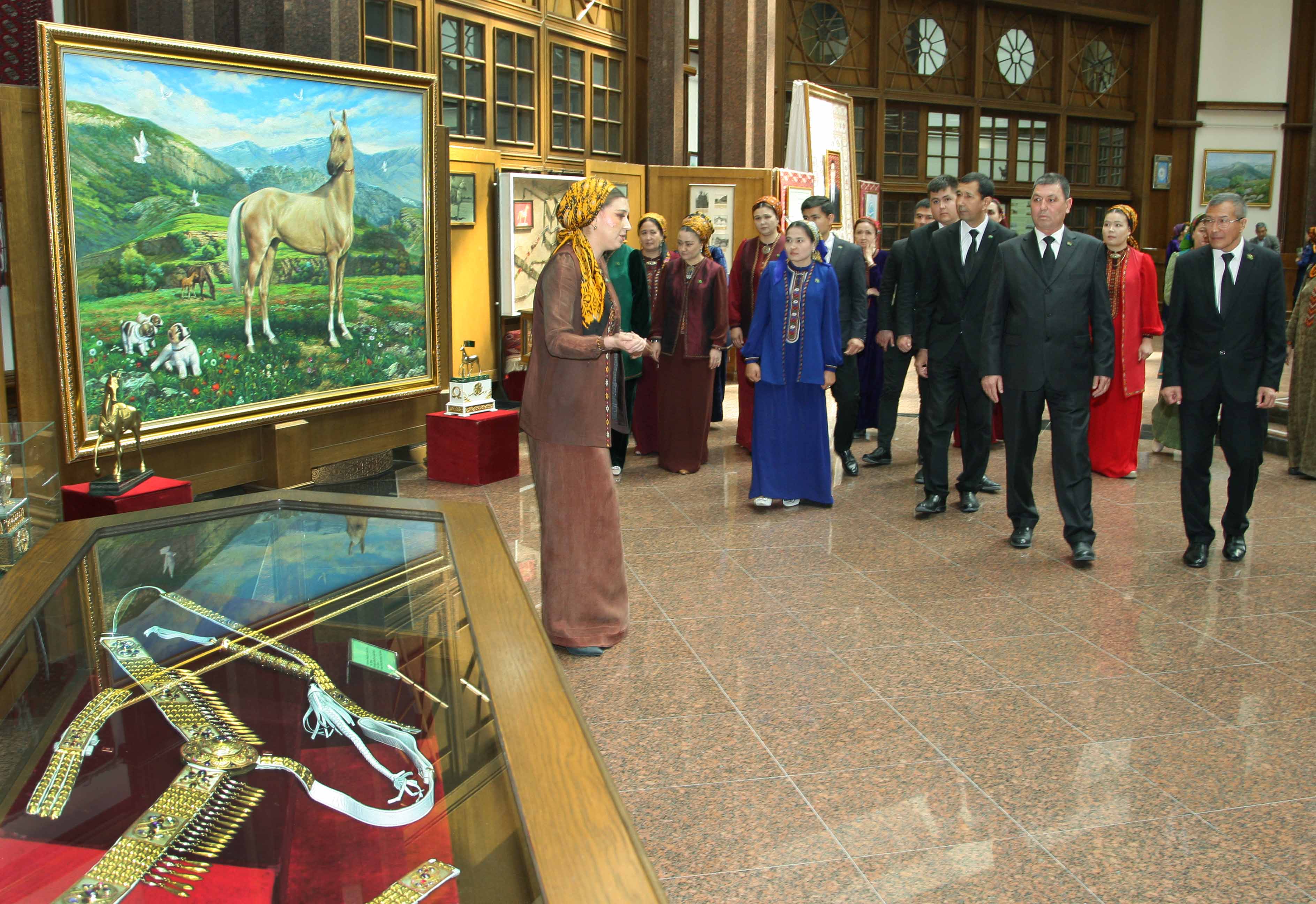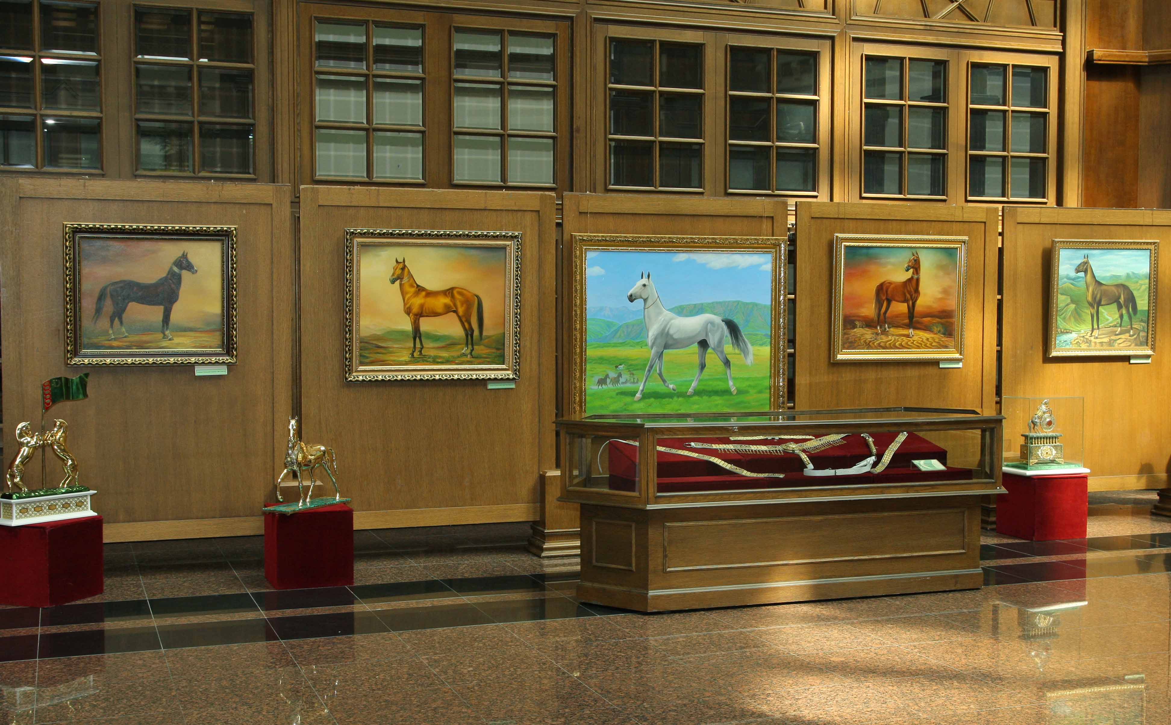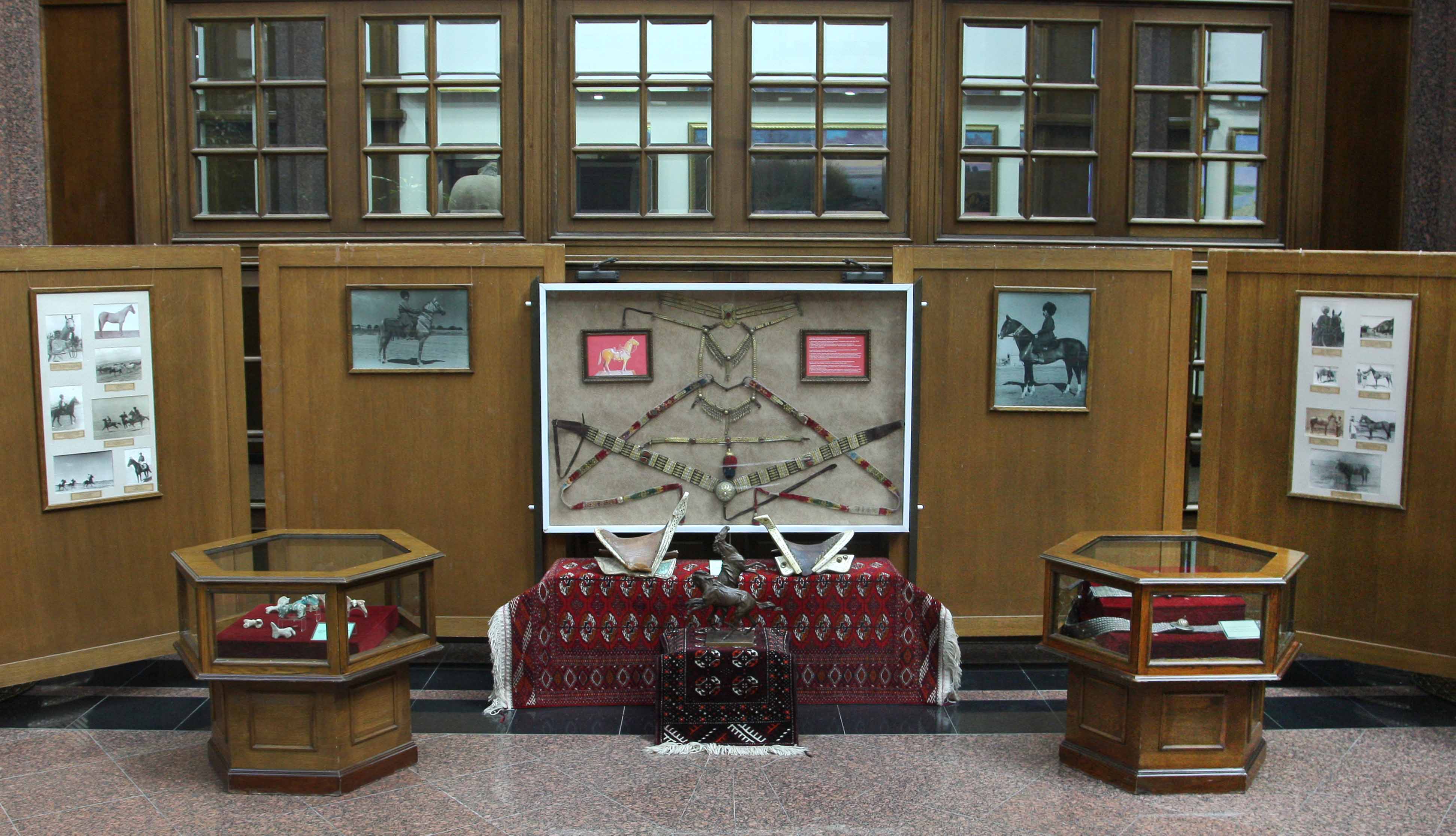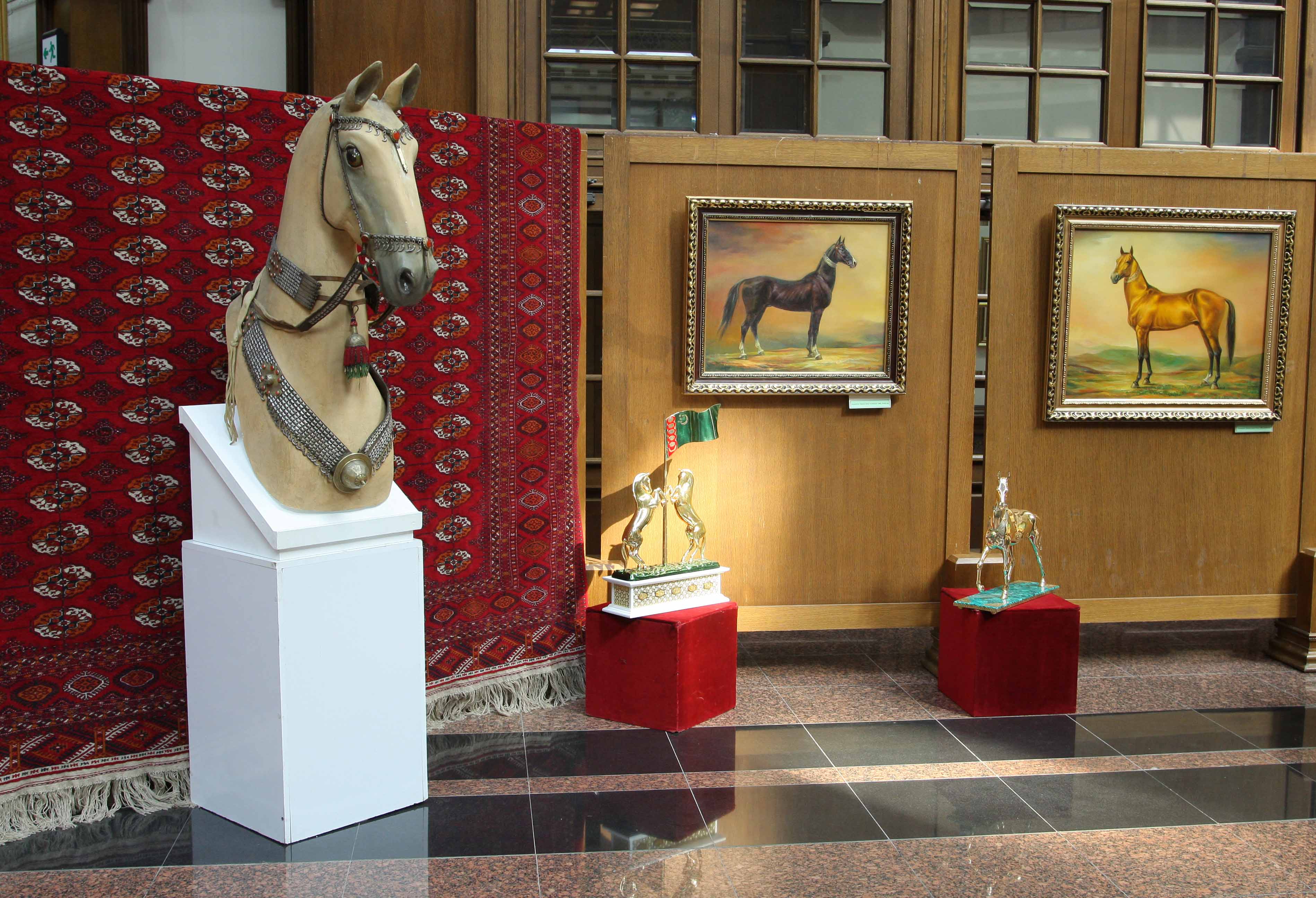 At the era of Revival of a new epoch of the powerful state our Motherland Turkmenistan, which is developed in a prompt rate thanks to tireless care of Hero Arkadag and the honourable President is signified by celebrations. Annual solemn celebration celebrated of a Day of Turkmen racer on last Sunday of April is a sign on the honour rendered to Akhalteke horse. At the State museum of the State cultural centre of Turkmenistan is organized a festive exhibition named «High respect to horse» in honour of a national Day of Turkmen racer. At the exhibition are presented the pictures of known artists, which glorify racers. Our ancestors considered a saddle of a horse to be more honourable than a throne, rendered all honour to a horse, adorned it with jewellery and carpet products. Here the special attention attract the ancient irreproachably decorated harness of Akhalteke horse. Horse accessories have also found their place at the exhibition: a saddle, a stirrup, whips, a bridle, a case for drinking bowl and a horseshoe, adornments: a breast collar, blinkers, front strap, an amulet. There are also horse cloths, shabrack, sweat cloth, feed bags for horses, saddle bags woven and decorated with a fringe, articles from felt mat enrich an exhibition still more. At the exhibition it is also possible to see modern jewellery, which glorify Akhalteke racers and mean prompt development of the epoch. In the course of the exhibition we can see an image of a Turkmen racer woven on a carpet, drawn on a picture and in a sculpture.