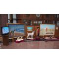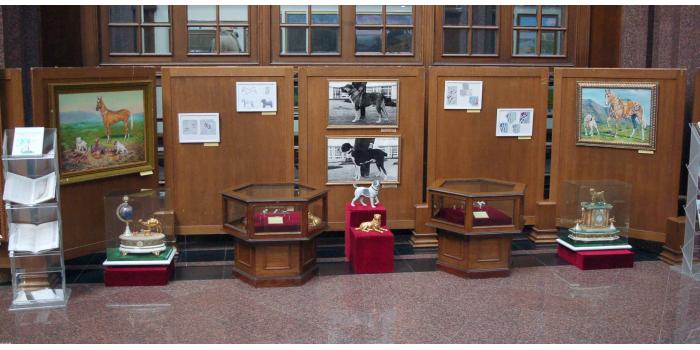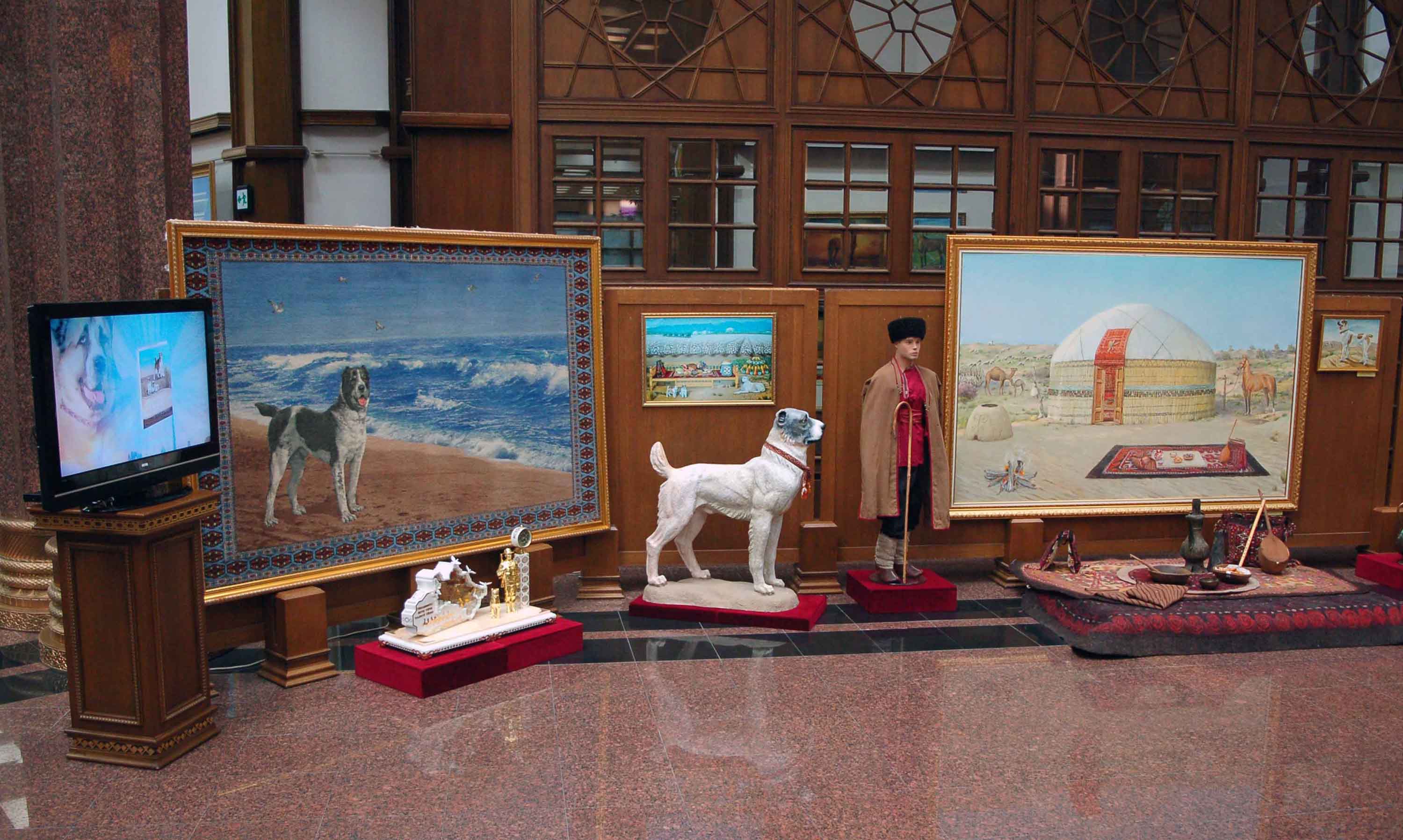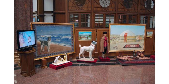 At the exhibition is possible to see presented to Hero Arkadag, the honourable President jewelry glorifying then era of Revival of a new epoch of the powerful state, Independence, Neutrality of Turkmenistan, the National flag, Turkmen alabais. The special place is given to the picture carpets presented to the honourable President. The harmonious image of Turkmen alabai along with carpet gels means, that it takes the big place in a life of the Turkmens. Here are artistically shown endurance, reliability, selflessness, devotion, goodwill - nice features of alabai. Among the picture carpets is possible to see a carpet “National tourist zone Avaza” where freely walks about Turkmen alabai, Turkmen yurta protected by alabai against the background of Turkmen nature. Besides that, in show-cases are placed archaeological finds, the clay figurines of dogs concerning III-II millenia, the Middle Ages, stored in the State museum. Various video-and photographic images of Turkmen alabais give the exhibition still more attractiveness.