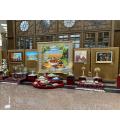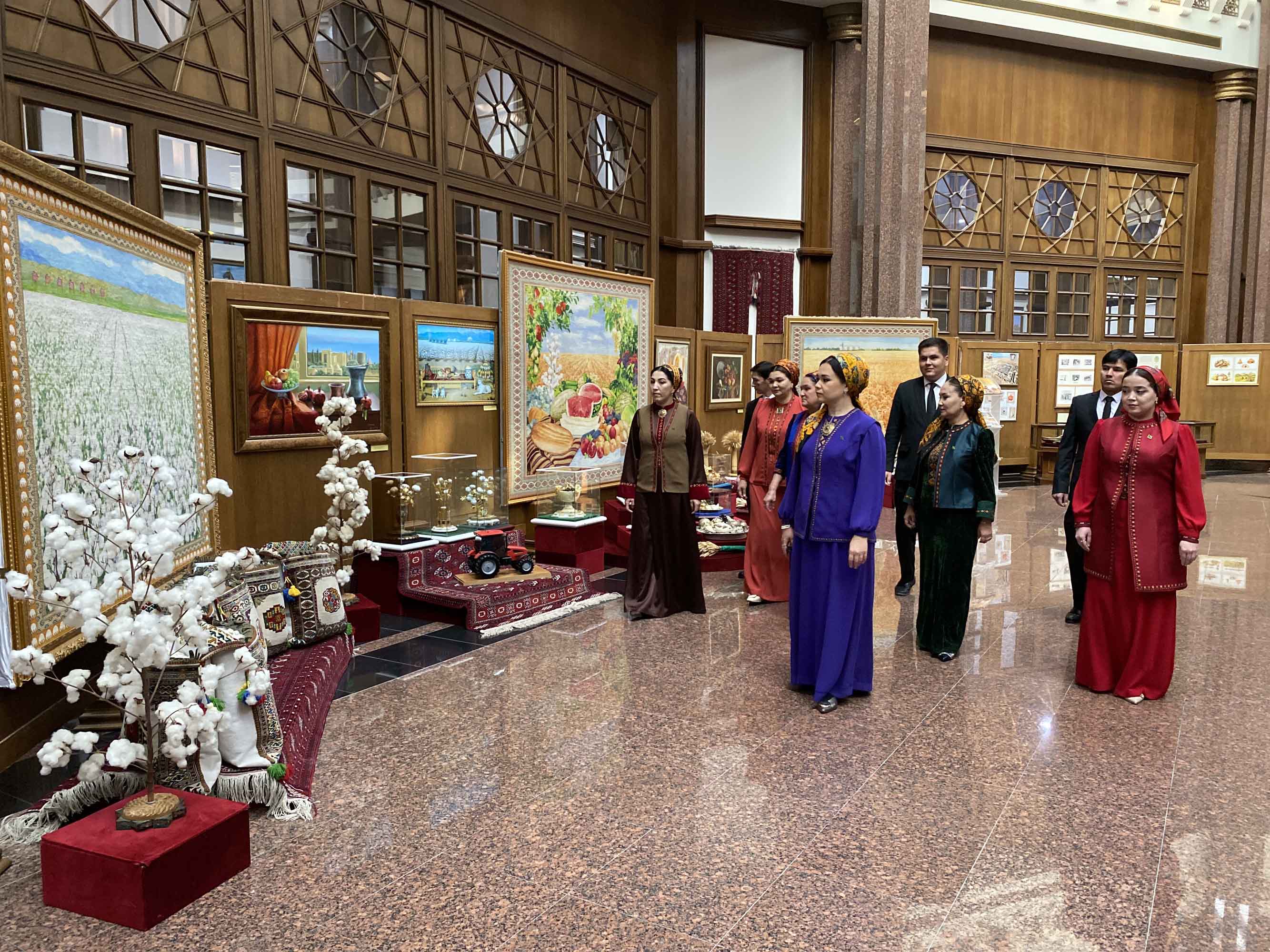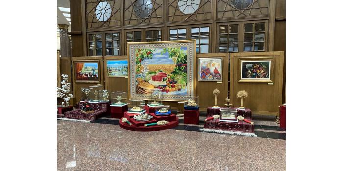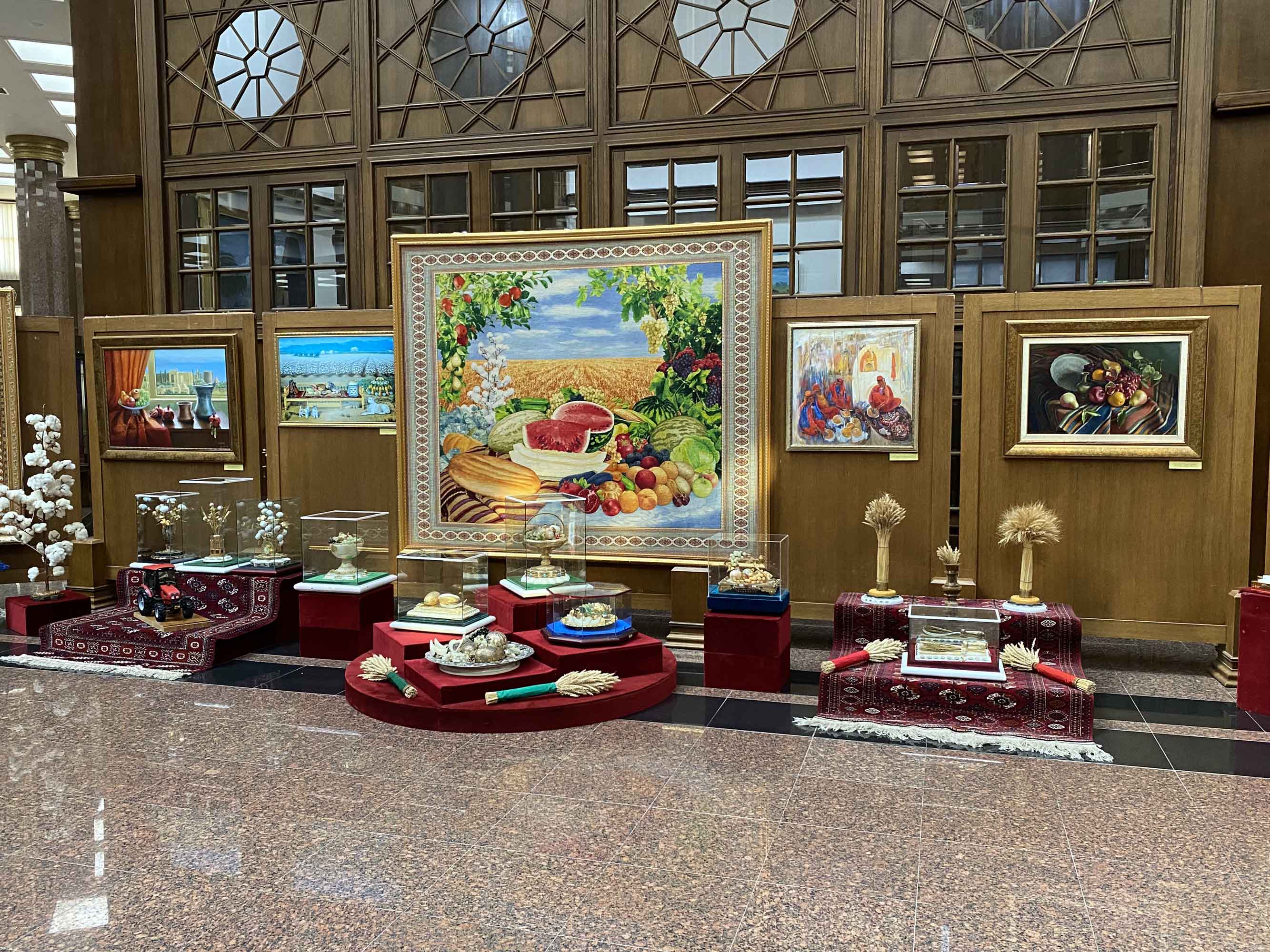 In the second section of theexhibition is told about achievements of our country in agriculture for the years of Independence. Photos and works of artists glorify the generosity of the Turkmen land. Special appeal to the exhibition give the carpet pictures, which show gold wheat, fields of «white gold», watermelons, melons and gourds and vegetables and fruits growing in our land. An exhibition is adorned by saddle-bags with sheaves of white wheat and a fine-stapled cotton, and with silkworm cocoons as well. Here are also located works of jewellers. They represent cotton-seed hulls, wheat ears, clusters of grape and other fruits made of semi-precious stones and metal.